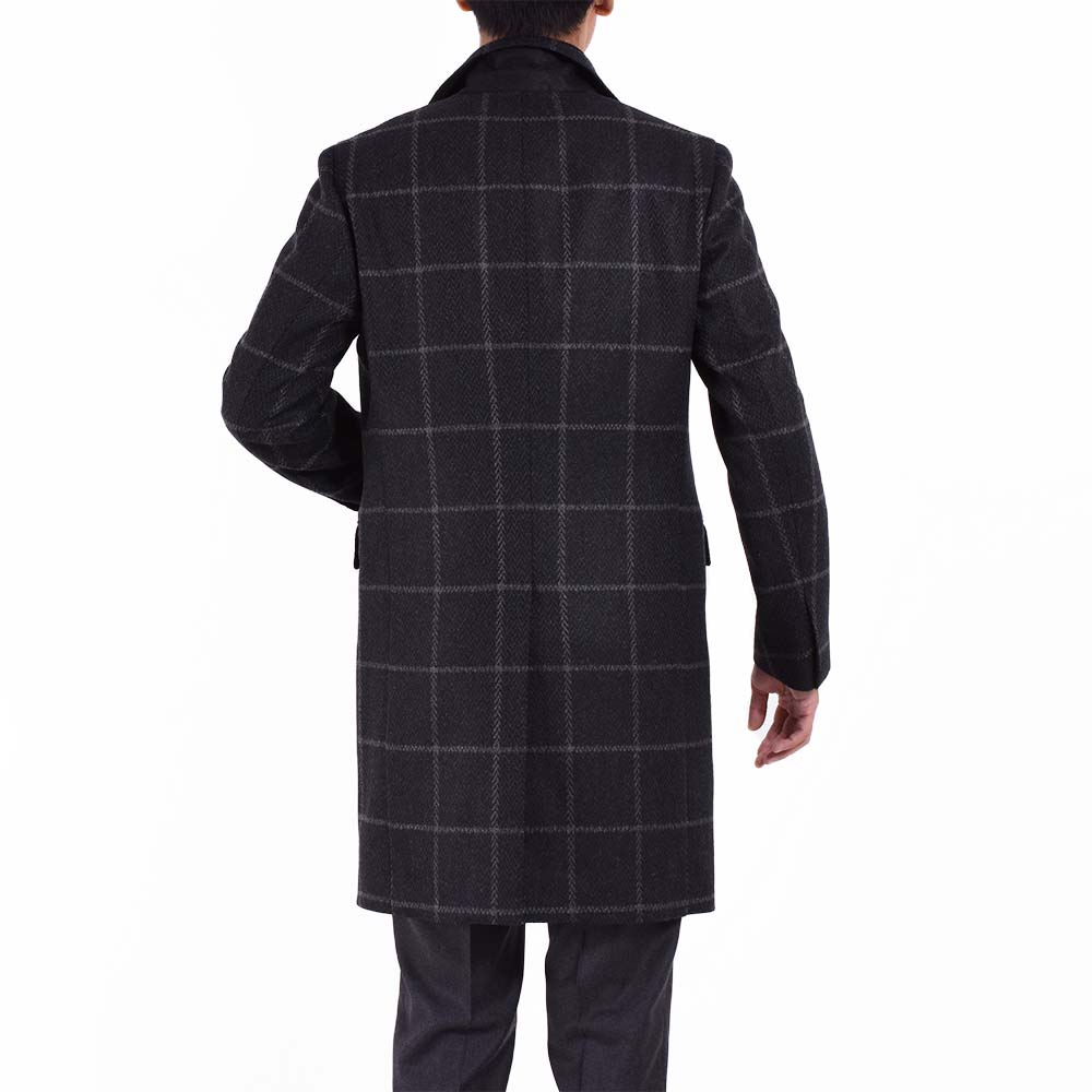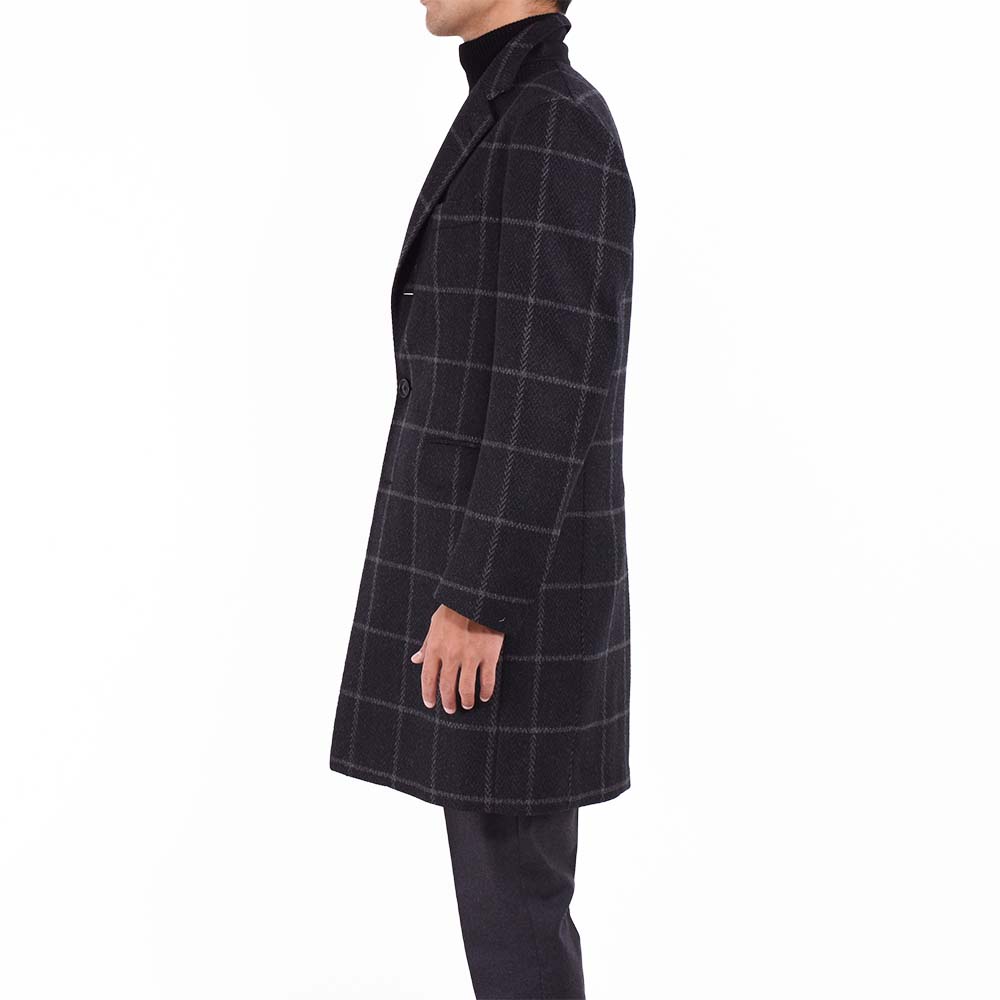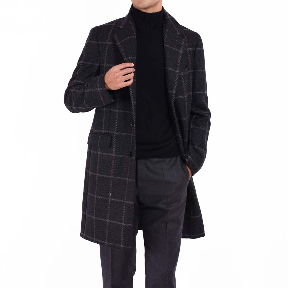 スーツ、ジャケットに続きスペシャルなコートが登場!ウィンドウペン柄とヘリンボーン柄が混じりあった独特な柄は、非常に洒落て見えます。ダークグレーで控えめな色味なので、派手すぎず、大人がさらっと着てかっこいい柄物コートはこの1着で間違いなしと言える逸品です。カシミア混の生地を使用しているので、柔らかさがほんのりと味わえる印象です。細身体型でジャケットの上からサイズ46を着用し、ピッタリでした。着丈は膝上約7cmくらいの位置でエレガントな印象。普段選ばれているサイズでよろしいかなと。