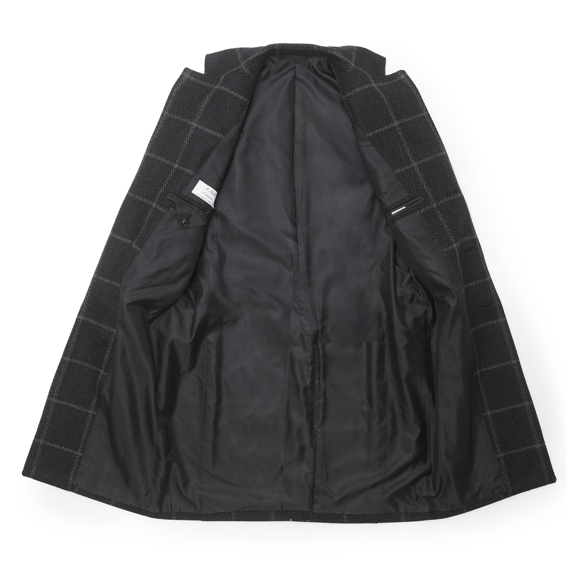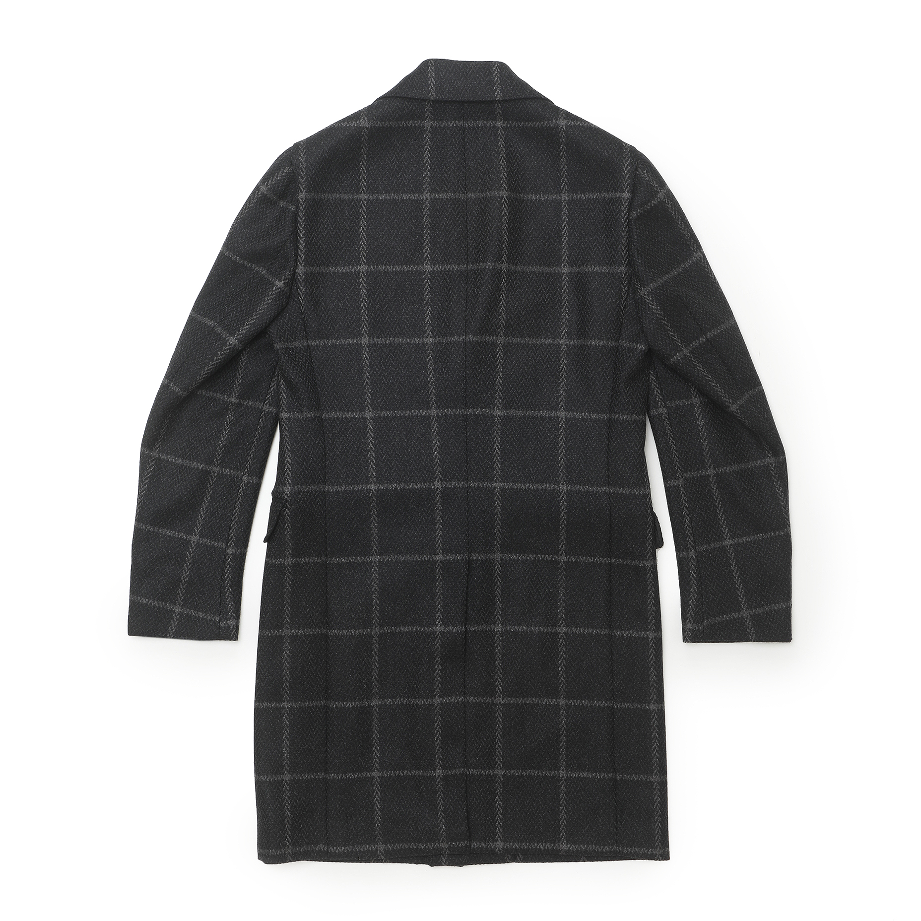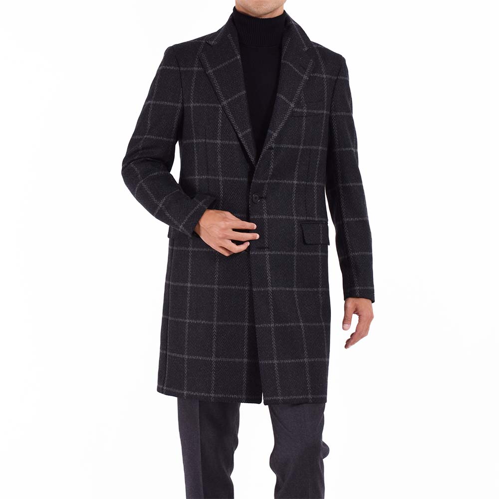 スーツ、ジャケットに続きスペシャルなコートが登場!ウィンドウペン柄とヘリンボーン柄が混じりあった独特な柄は、非常に洒落て見えます。ダークグレーで控えめな色味なので、派手すぎず、大人がさらっと着てかっこいい柄物コートはこの1着で間違いなしと言える逸品です。カシミア混の生地を使用しているので、柔らかさがほんのりと味わえる印象です。細身体型でジャケットの上からサイズ46を着用し、ピッタリでした。着丈は膝上約7cmくらいの位置でエレガントな印象。普段選ばれているサイズでよろしいかなと。