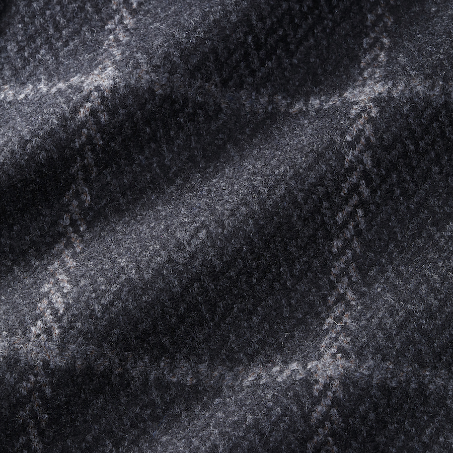・ヘリンボーン織りをベースにウィンドウペンを載せた洒脱な生地はカシミア混ウール。トーンオントーンの絶妙な柄行き、キッチリと目が詰まりヌメリ感あるタッチ、ほのかな光沢感による上品さ、と非の打ち所がありません。