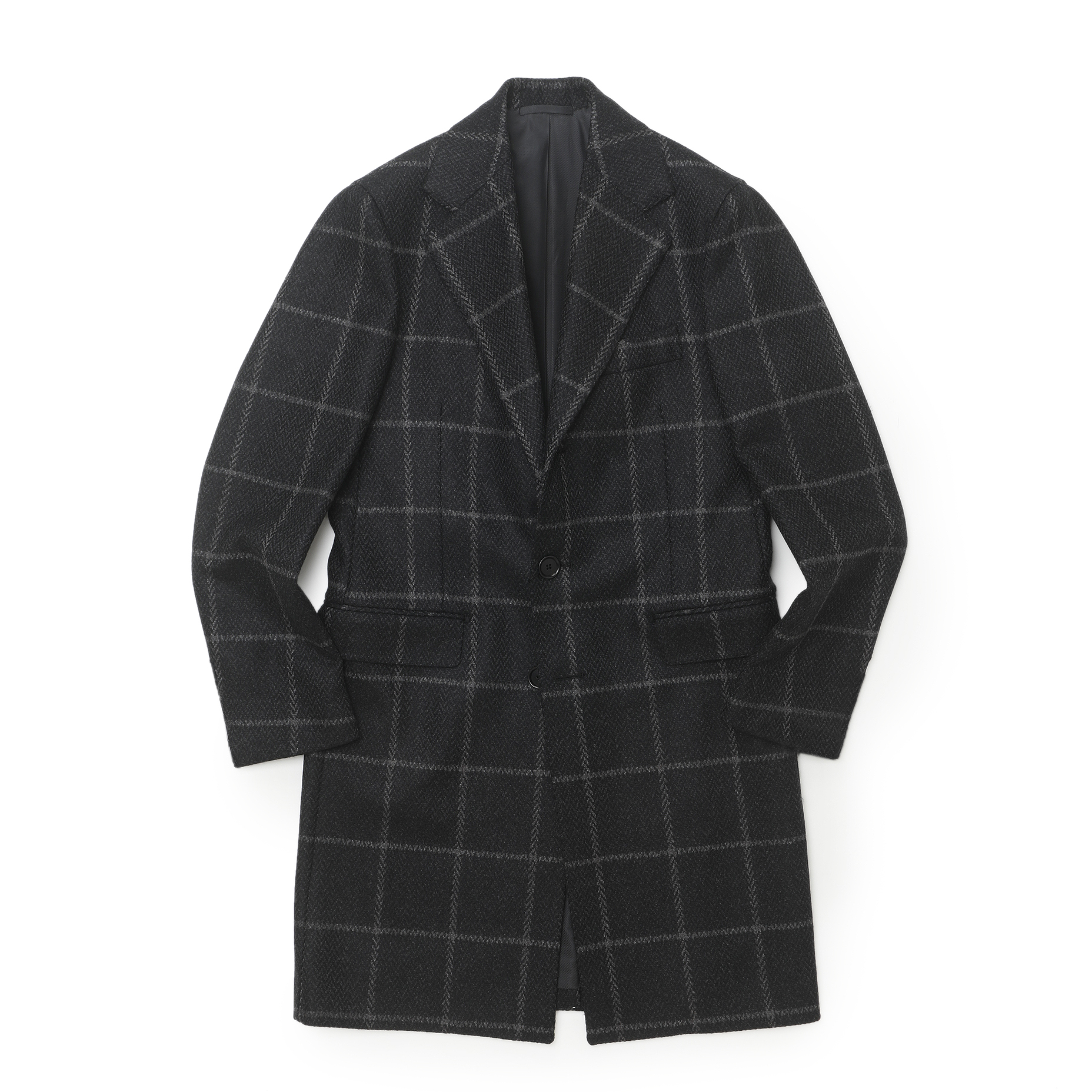 ・ノッチドのテーラードカラー、打ち抜きの3ボタンというベーシックなチェスターコート。ナポリらしく最小限の副資材で作られた軽量感のある柔らかな仕立ては「De petrillo(デ ペトリロ)」のジャケットやスーツと同様です。