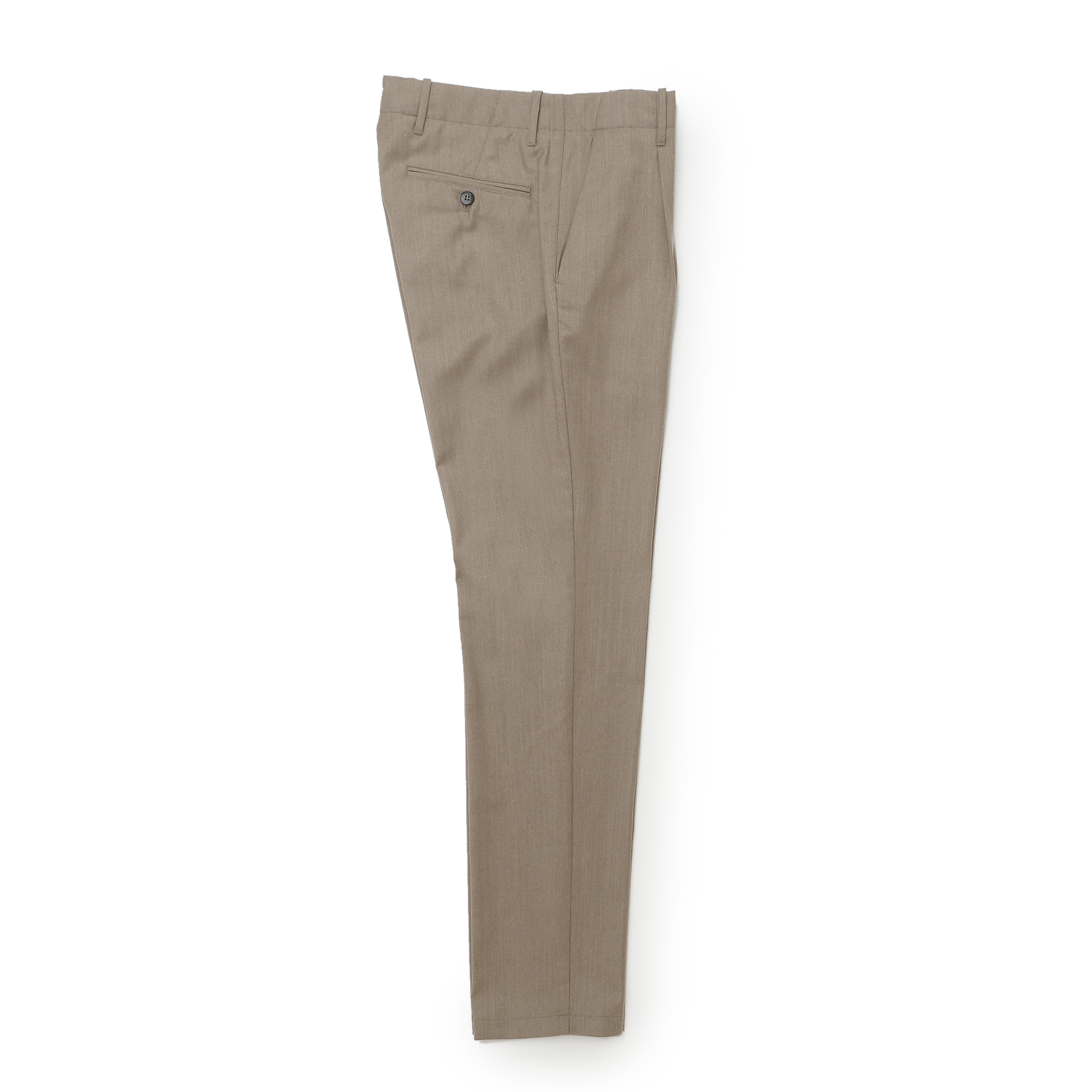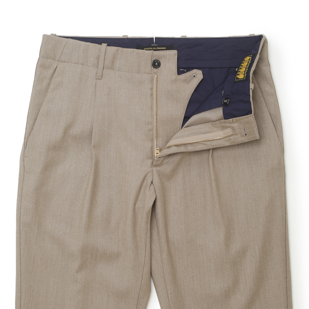 ・プリーツが入っていることで絶妙な加減でゆとりある腰廻りになっており、膝から裾にかけてはテーパードをかけたシャープなシルエット。テーパードをかける位置を高めに設定することで、膝から下がほっそり見えるのが特徴。ロールアップして短めの丈で穿いても膝下が長く、スッキリと見えます。