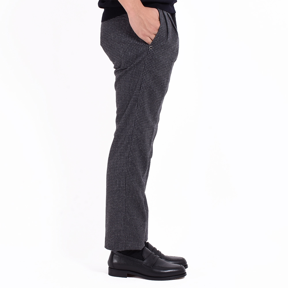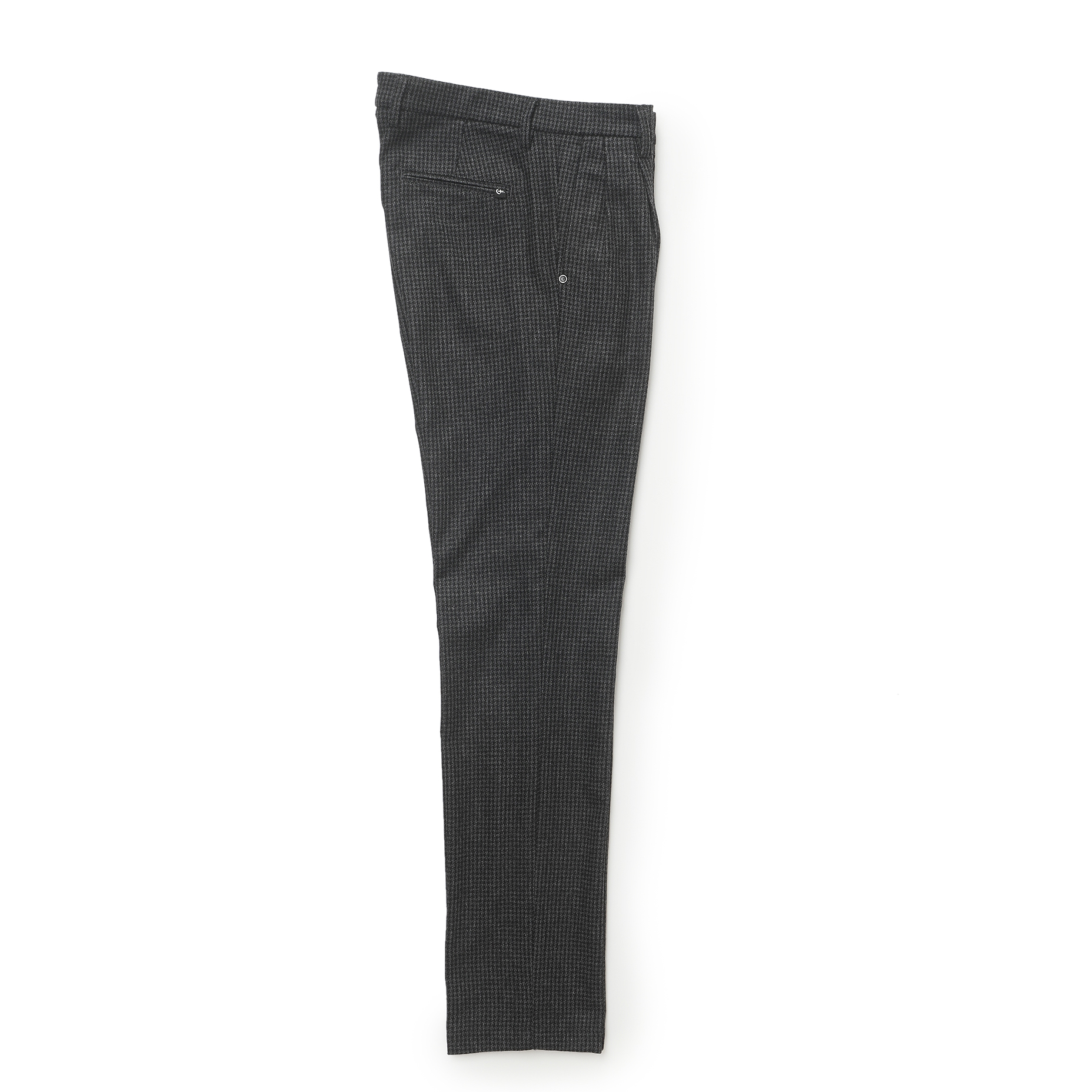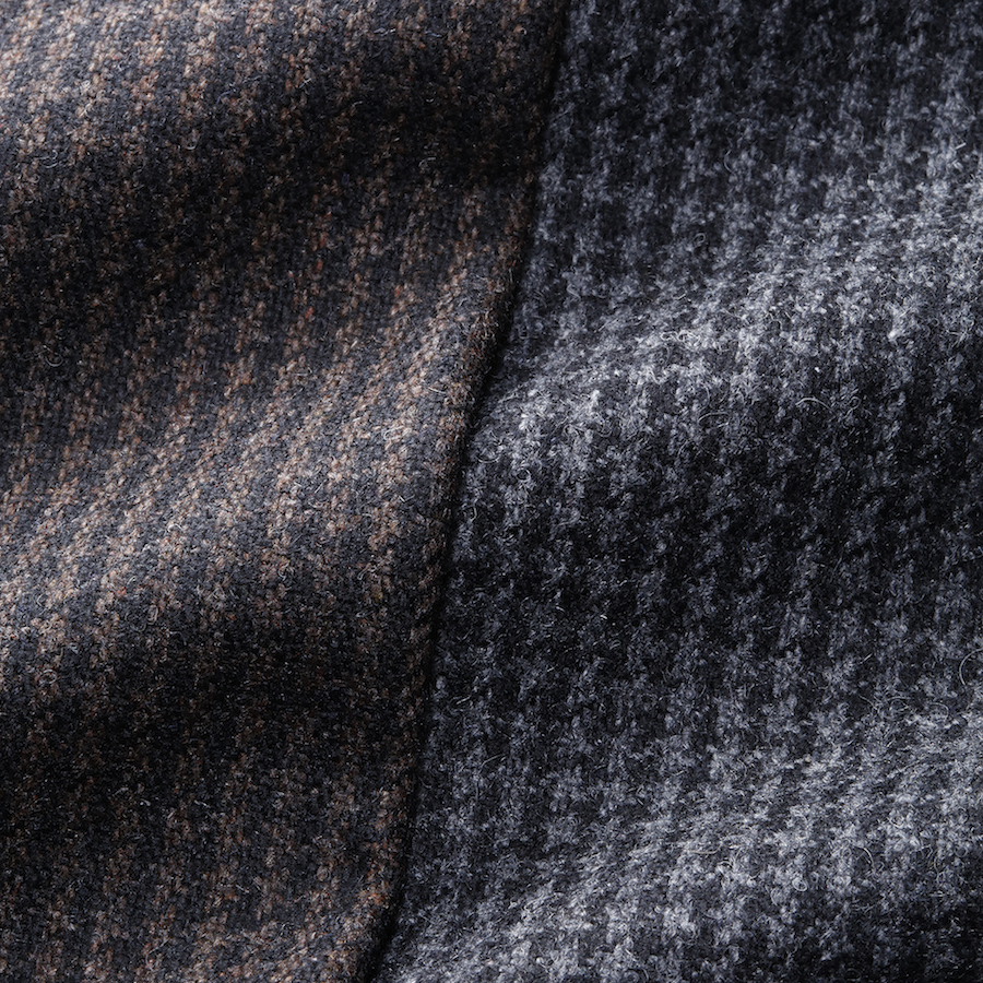 ・生地はウールをベースにナイロンやポリエステルをブレンドし強度を持たせた五織混ハウンドトゥース。ウール100%にはない軽快さと微光沢が特徴です。