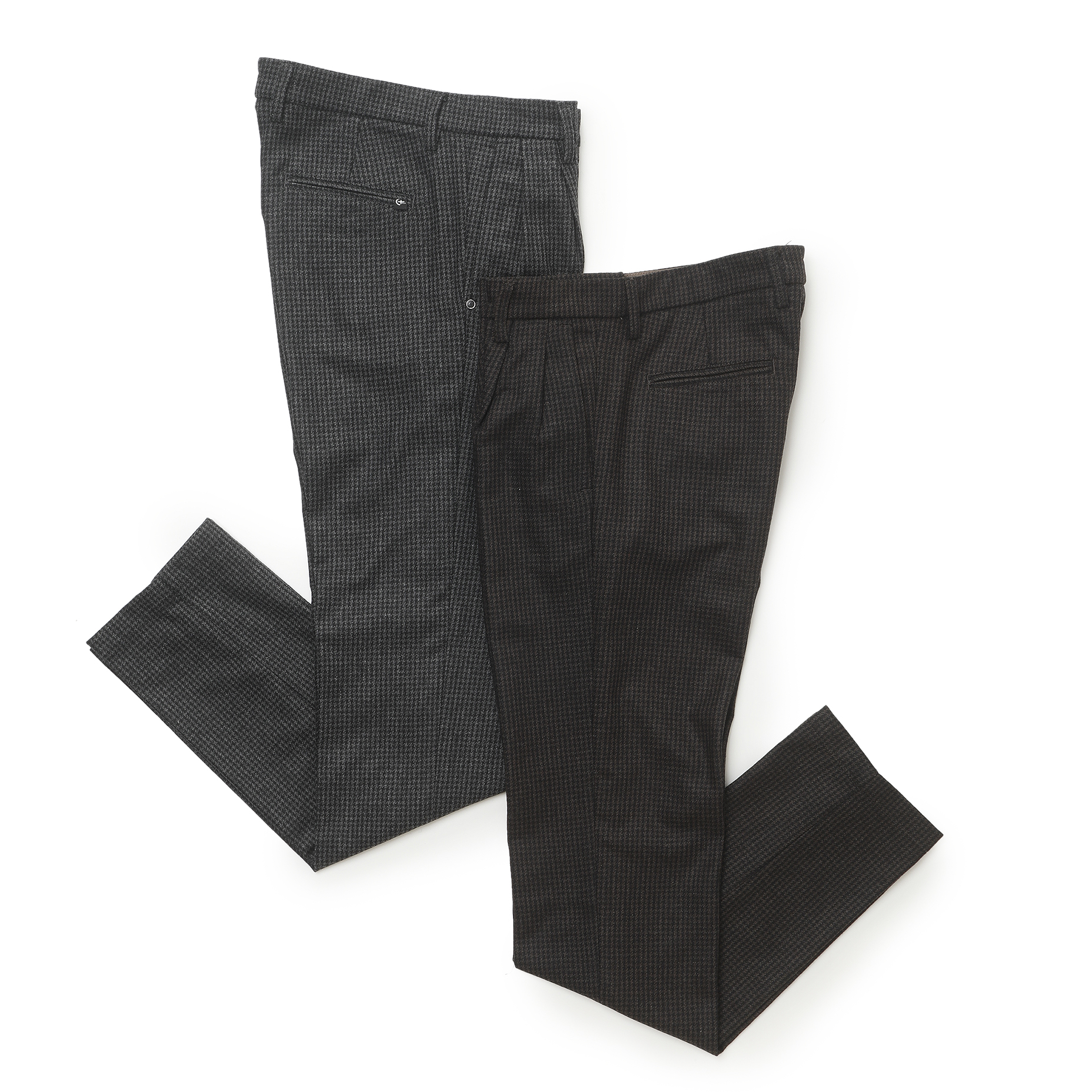 ・グレー×ブラック、ダークブラウン×ブラックの配色によって非常にモダンな印象に映ります。トップスを選ばず、無地感覚で穿けるチェックパンツとして汎用性抜群!