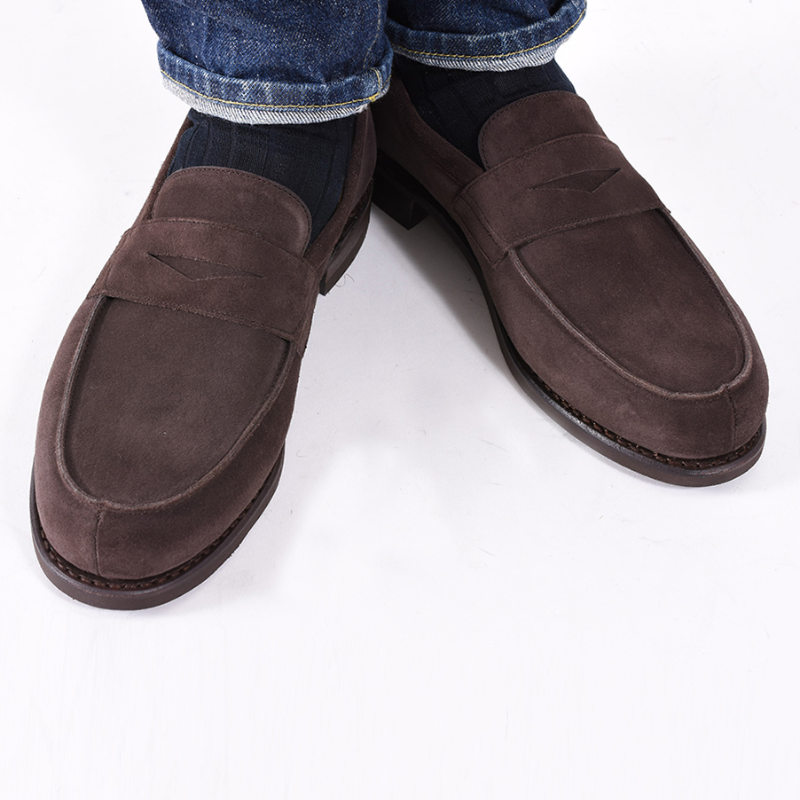 ・モデル"DAX"はベロアレザーがアッパーに搭載されたローファー。程よいトウのボリューム感やノーズの長さによる絶妙なバランスが特徴。実にフランス靴らしい顔つきのローファーで、カジュアルスタイルに合わせれば品良く、ドレススタイルに合わせればリラックス感をもたらす汎用性があります。