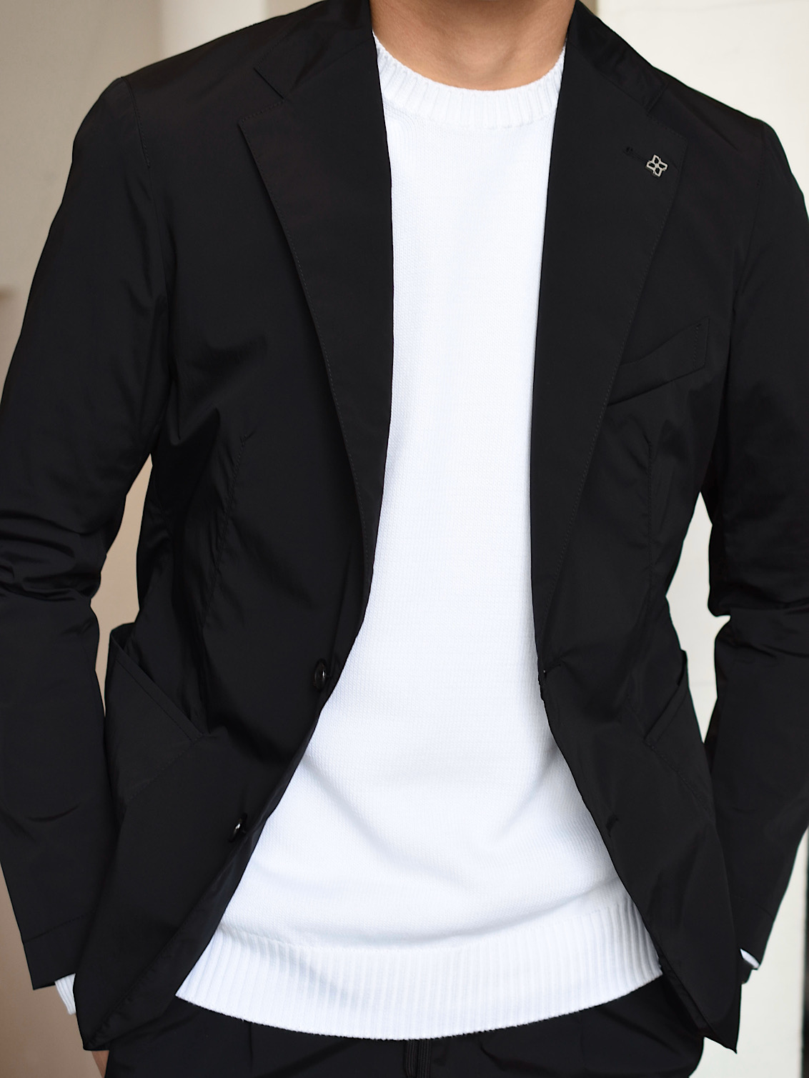・ネック周りやボディとスリーブの接続部分には美しいヘラシを多用。また、よれづらいリブも安心感があり、「FEDELI (フェデリ)」の高い技術力が窺えます。