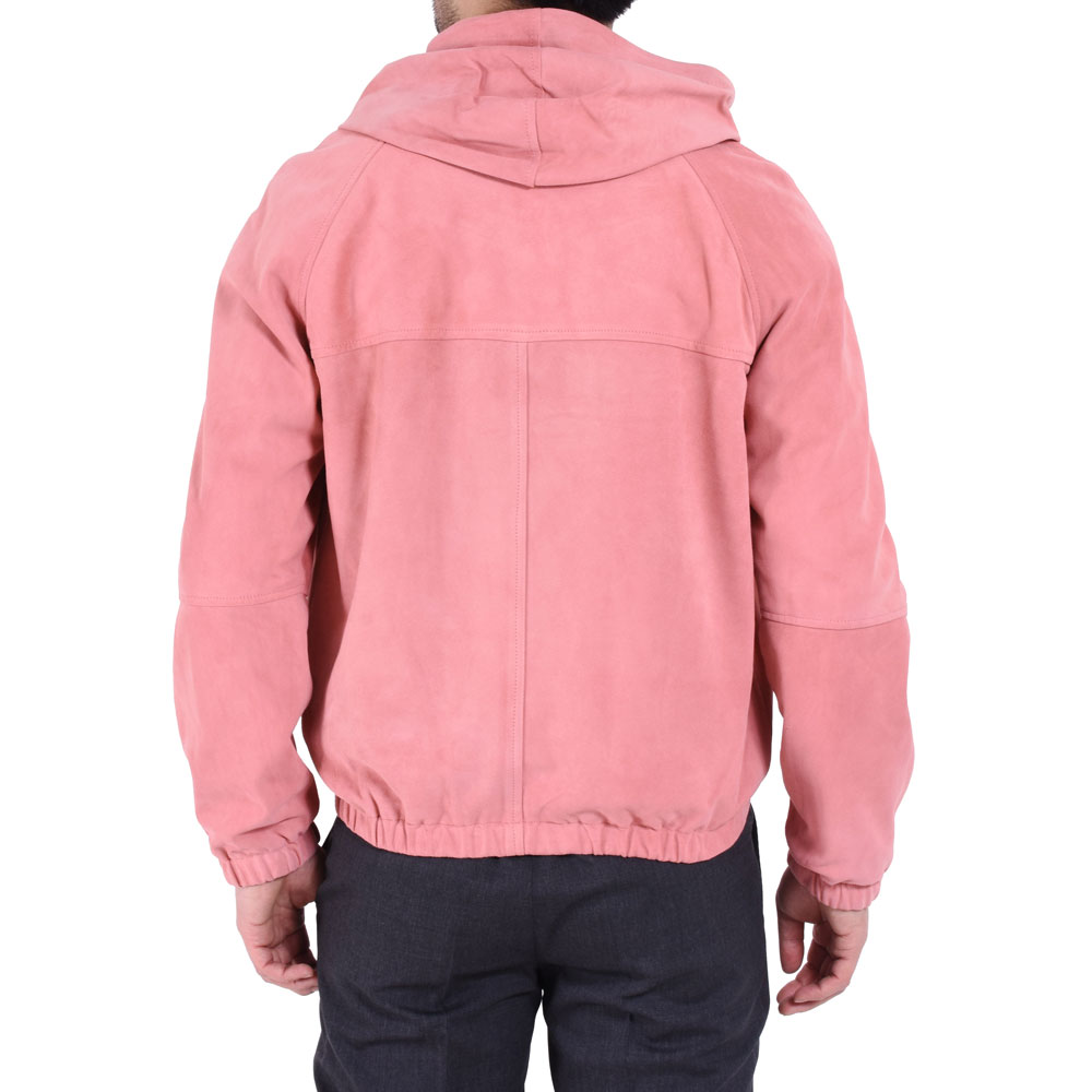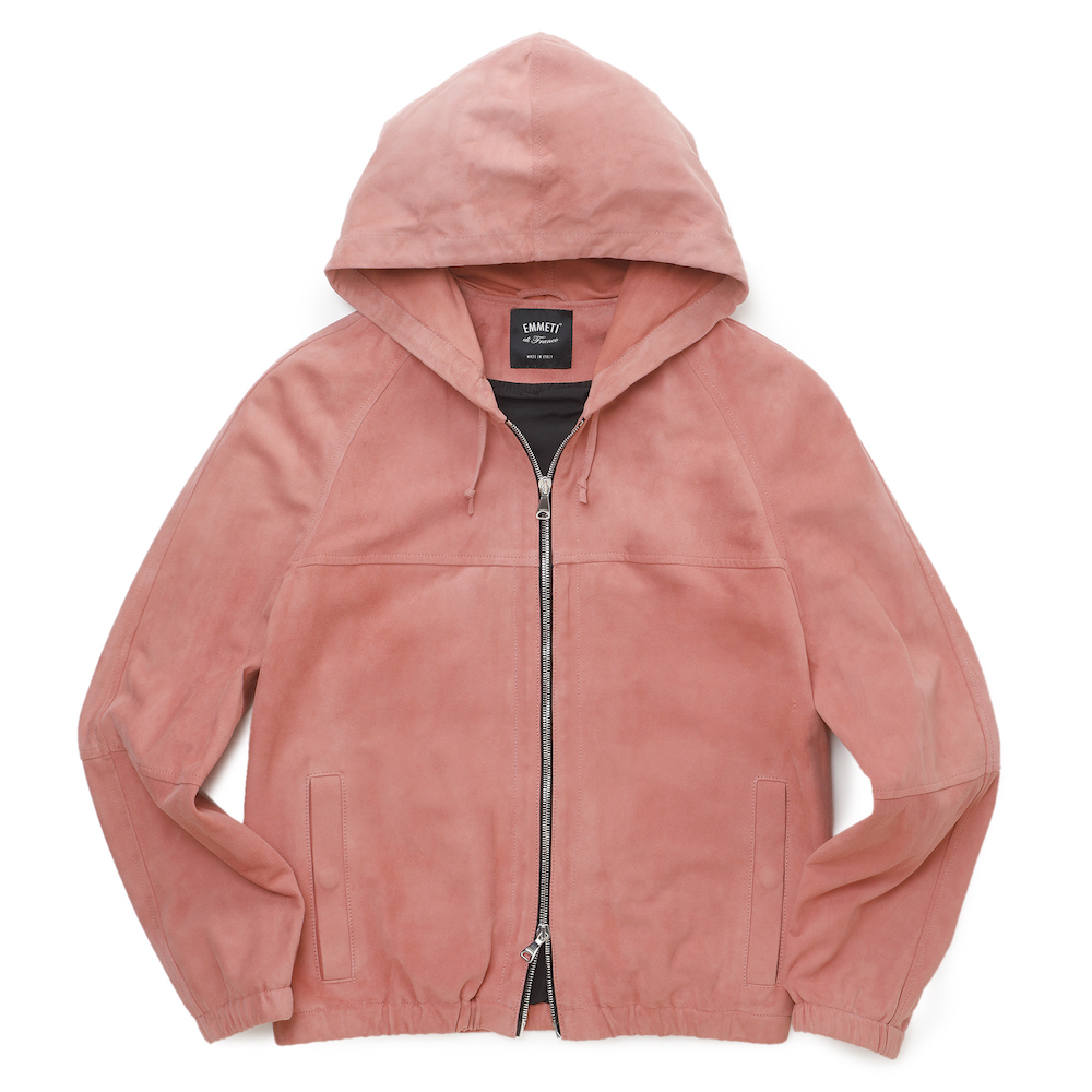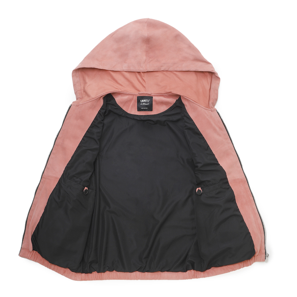 ・採用モデルの"JAYDON(ジェイドン)"は元々一枚仕立てでブロンズパーツが付属。色移り止め加工をしたスウェードレザーですが、ニットなどをインナーに着用しても色移りが無く、滑りが良いようにフード以外に裏地を付けました(これによって内ポケットも二つ付属)。さらにブロンズパーツだったのをシルバーパーツに変更することでシャープに、そしてモード感ある見え方に。