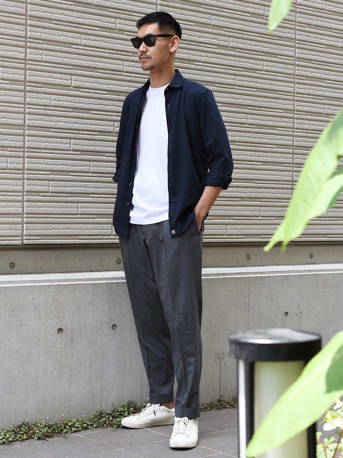 ・安定感ある股上の深さ、ワタリはゆとりがあるもののテーパード感の強いシルエットに仕上げられており、ちょいユルな雰囲気が楽しめます。