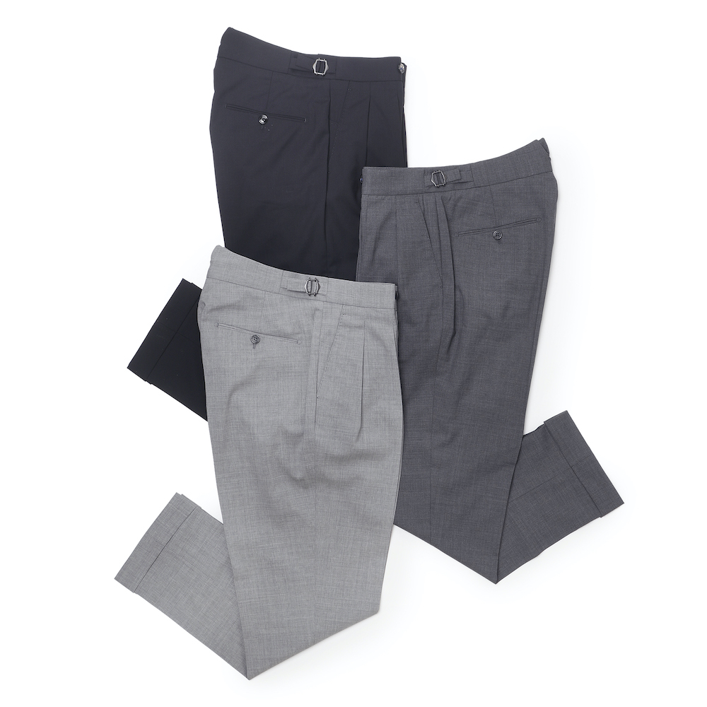 ・グルカパンツがモチーフとなっており、特徴的なディテールはサイドアジャスター、2インプリーツ、そしてハイバック。フロント持ち出しの長さは控えめにすることでクラシカル過ぎない見え方に。