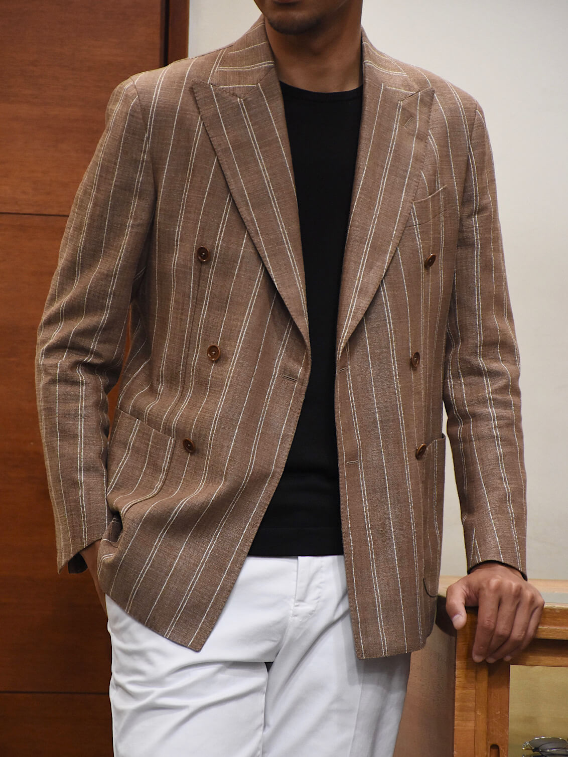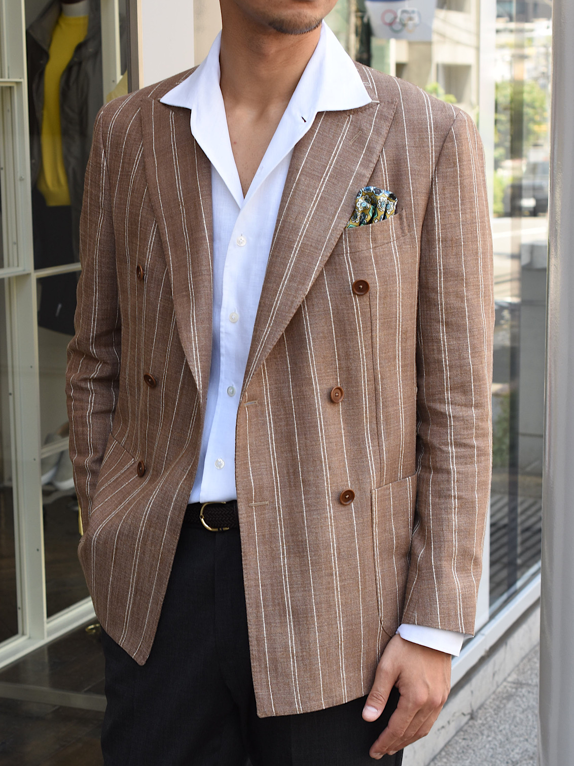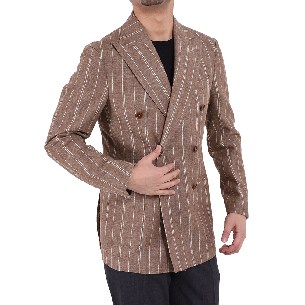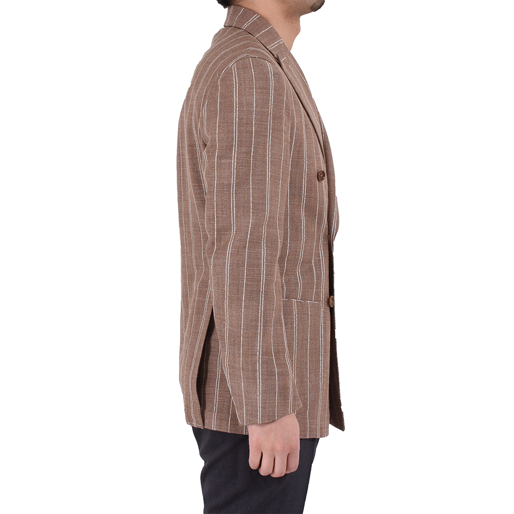 今季BRではお勧めの配色である、ライトブラウンに白ストライプ柄のジャケット。春夏らしい色味でありながら、上品な要素もしっかりキープ。生地はシルク、リネン、ナイロンの三織混。通気性があり少しざっくりとした生地感ではありますが、とてもしっかりした質感になっております!