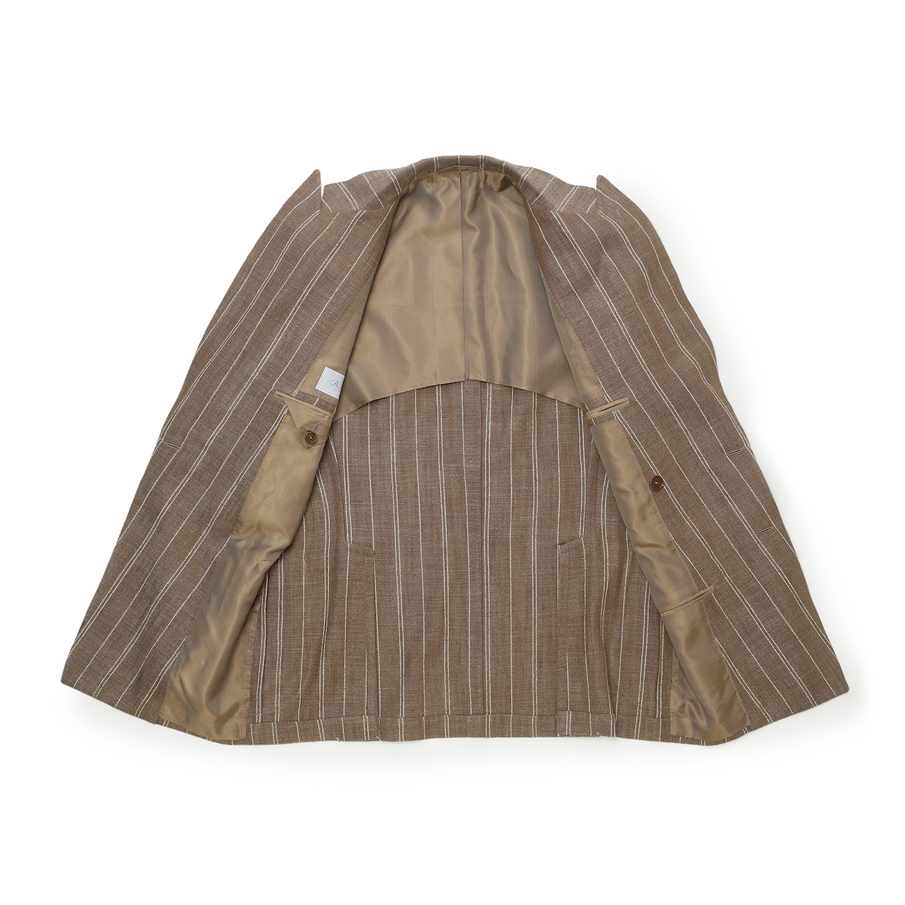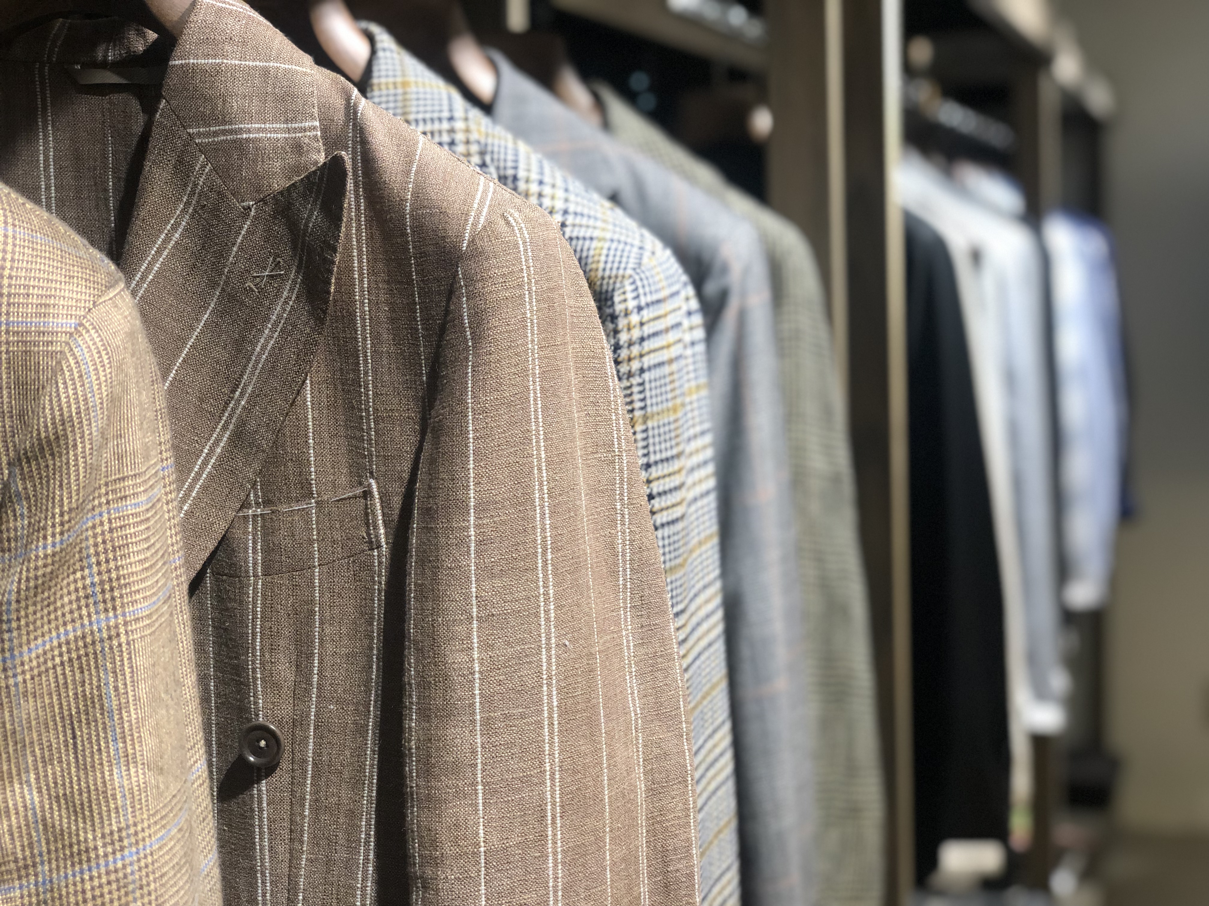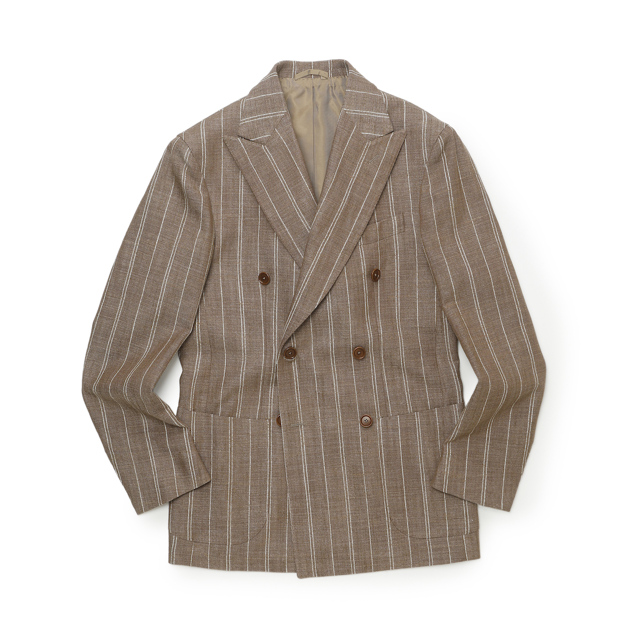 今季BRではお勧めの配色である、ライトブラウンに白ストライプ柄のジャケット。春夏らしい色味でありながら、上品な要素もしっかりキープ。生地はシルク、リネン、ナイロンの三織混。通気性があり少しざっくりとした生地感ではありますが、とてもしっかりした質感になっております!