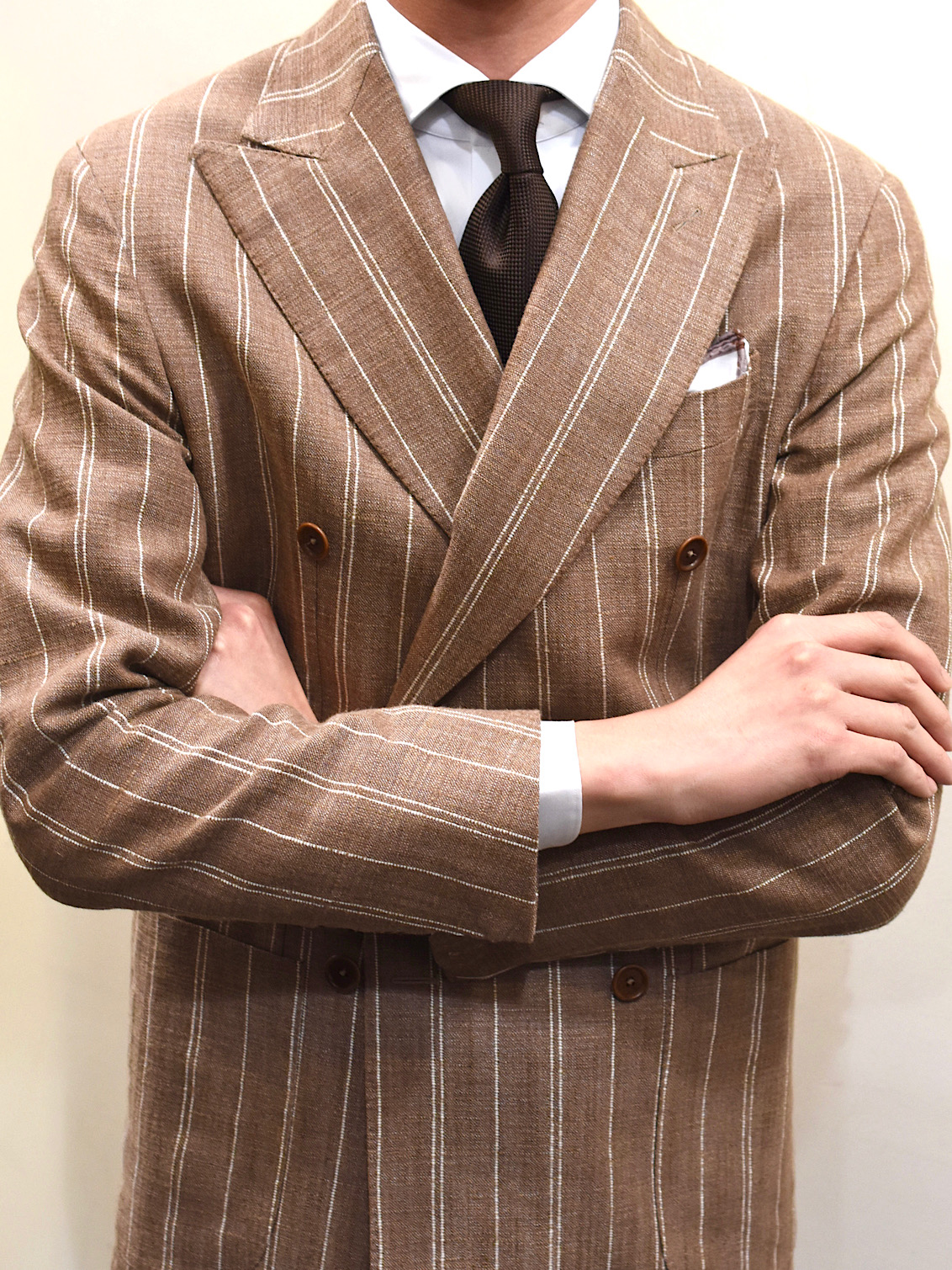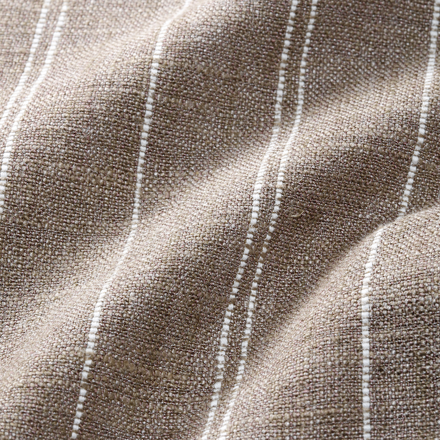 ・決して土臭くならない品のあるブラウン系の色合い、トーンオントーンで入れられたベージュのストライプ、シルクとリネンをベースにした豊かな表情を浮かべる生地感。展示会時に多くのバイヤーに絶賛されたと言われる日本エクスクルーシブの生地を採用した一着です。