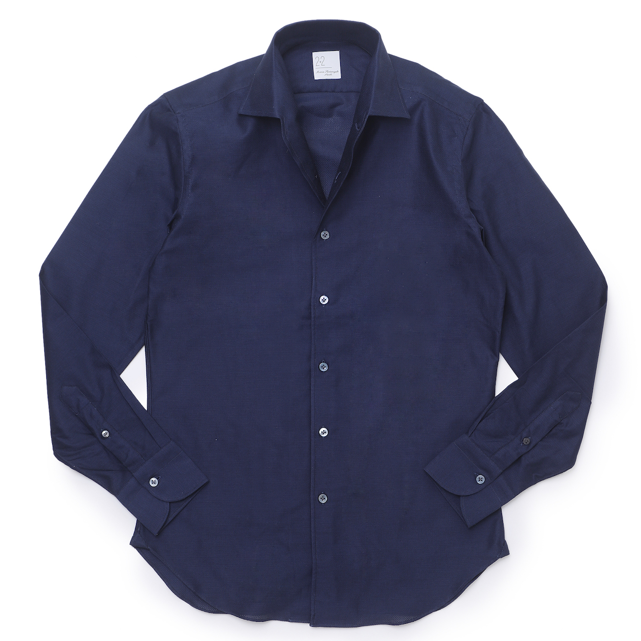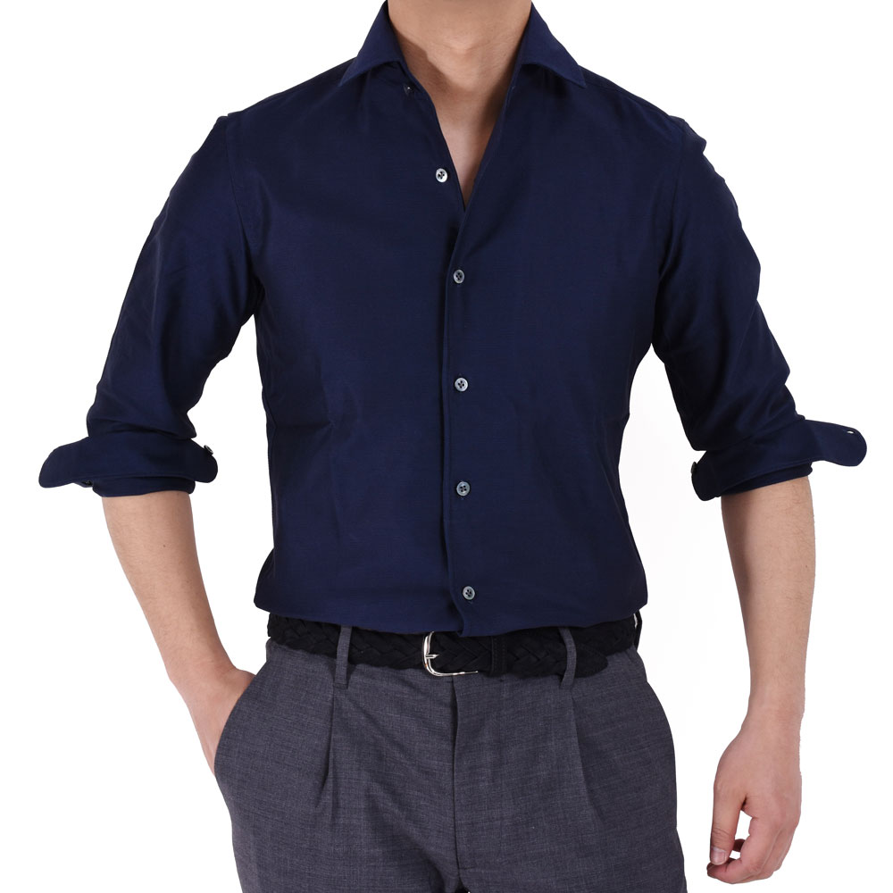・襟型"MARCELLO(マルチェッロ)"は、イタリアの名優マルチェッロ・マストロヤンニに由来する名前を持つワンピースカラー。襟を一枚で作るためフロントボタンの裏側部分に見返しを付ける必要があり、生地を多く使うラグジュアリーな作りが特徴です。
