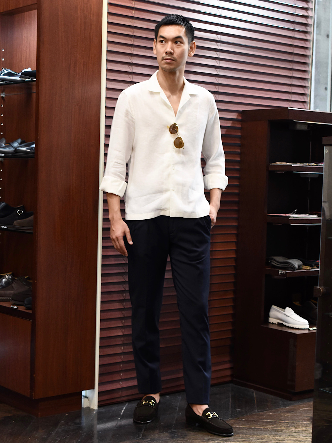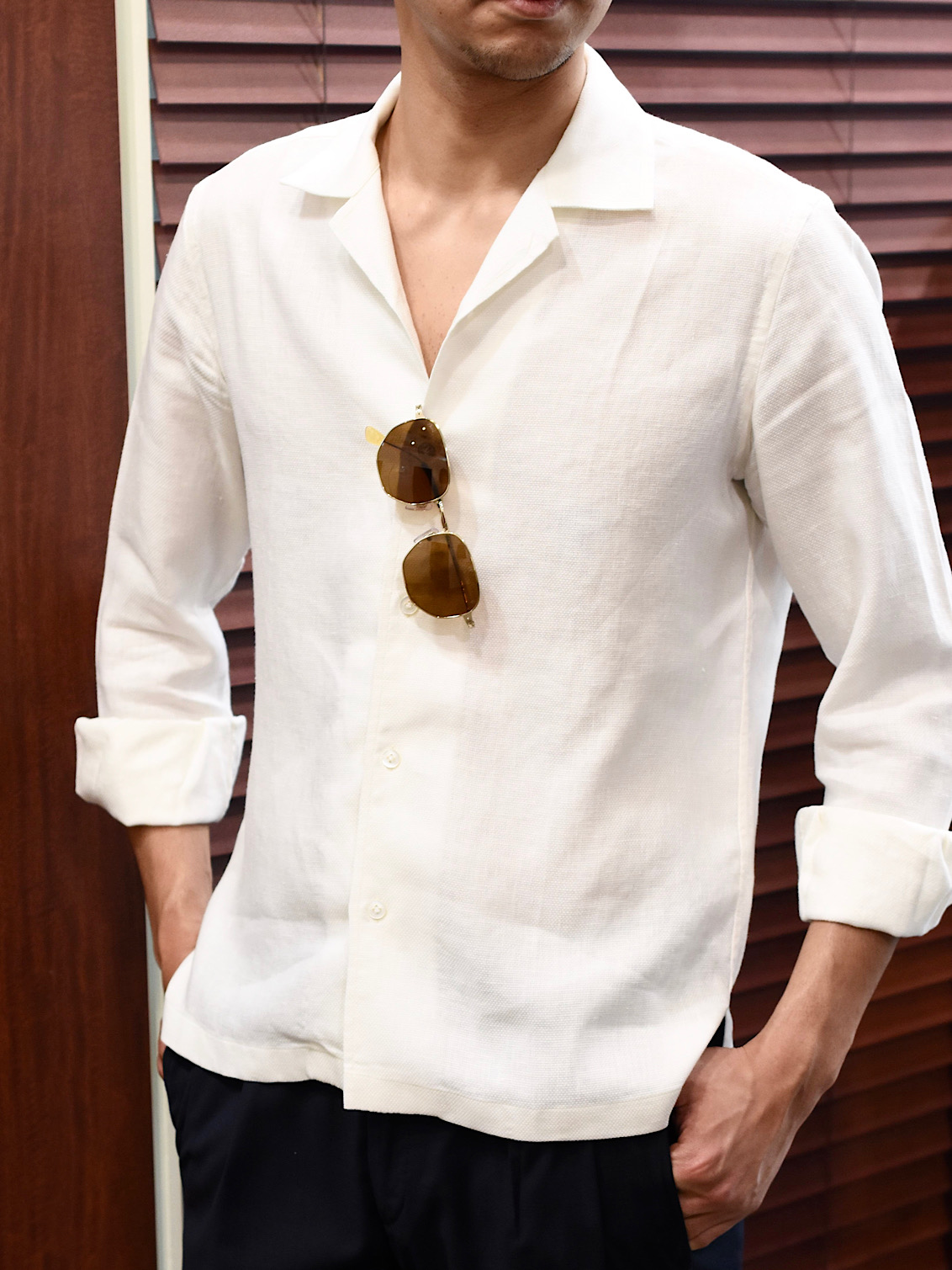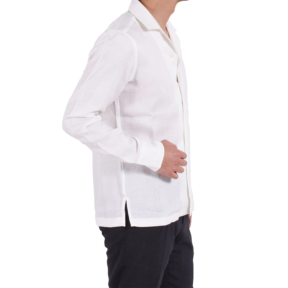 ・生地はリネン100%のバスケット織り。通気性は確保しながらもしっかり感があるので、一枚で着てもサマになる生地です。