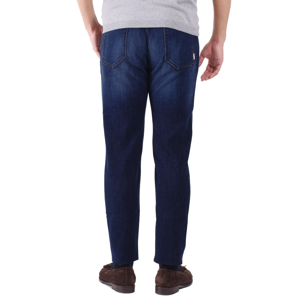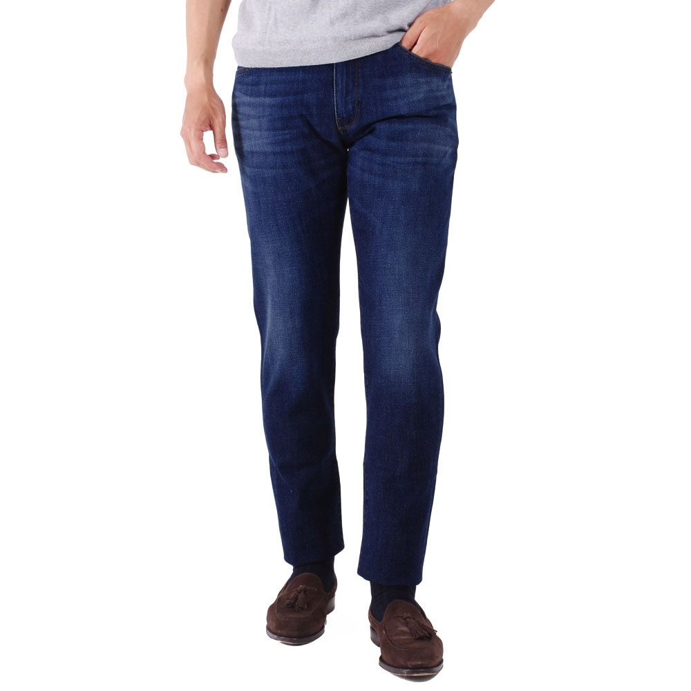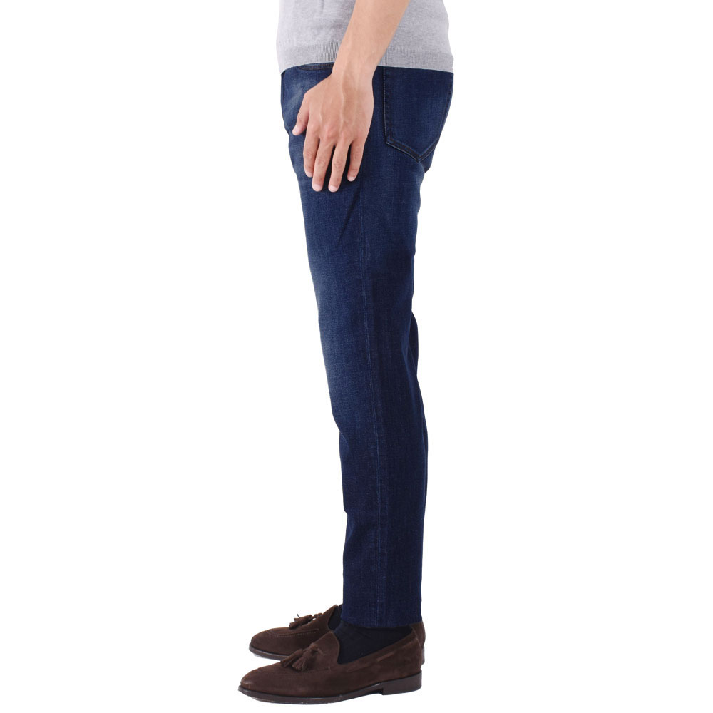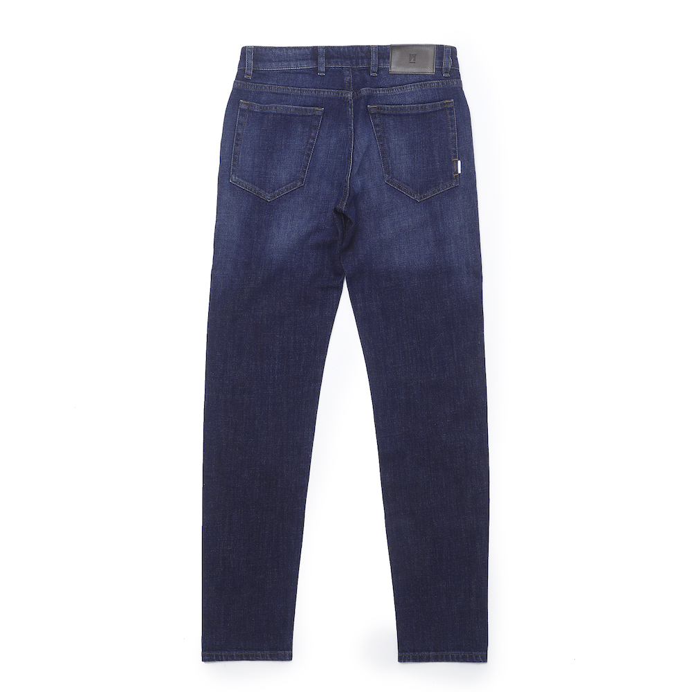 ・生地は通年穿けるくらいの厚みでストレッチ性抜群。深みある色合いが美しいブルーデニムは縦落ち感のある加工具合が秀逸です。