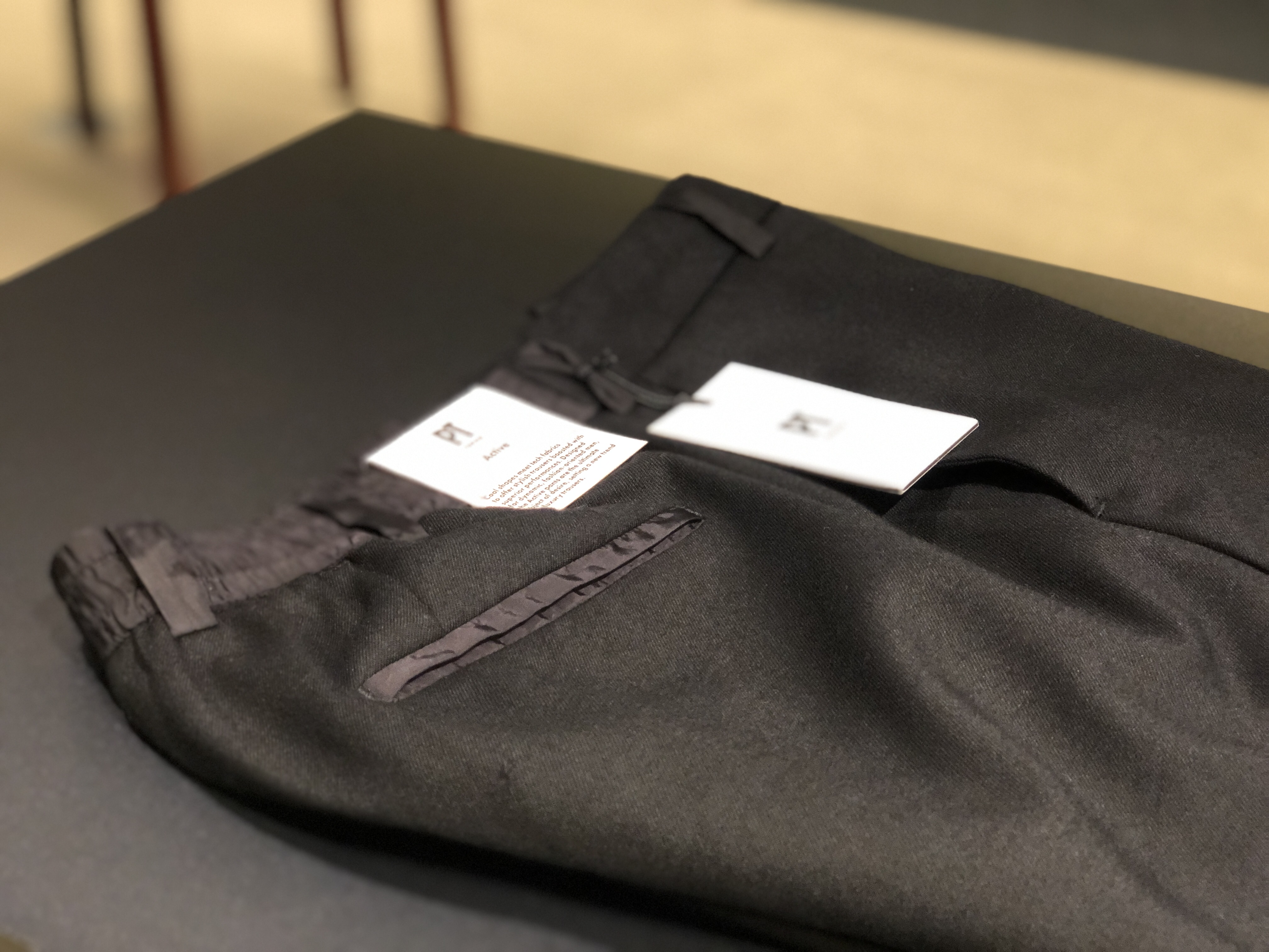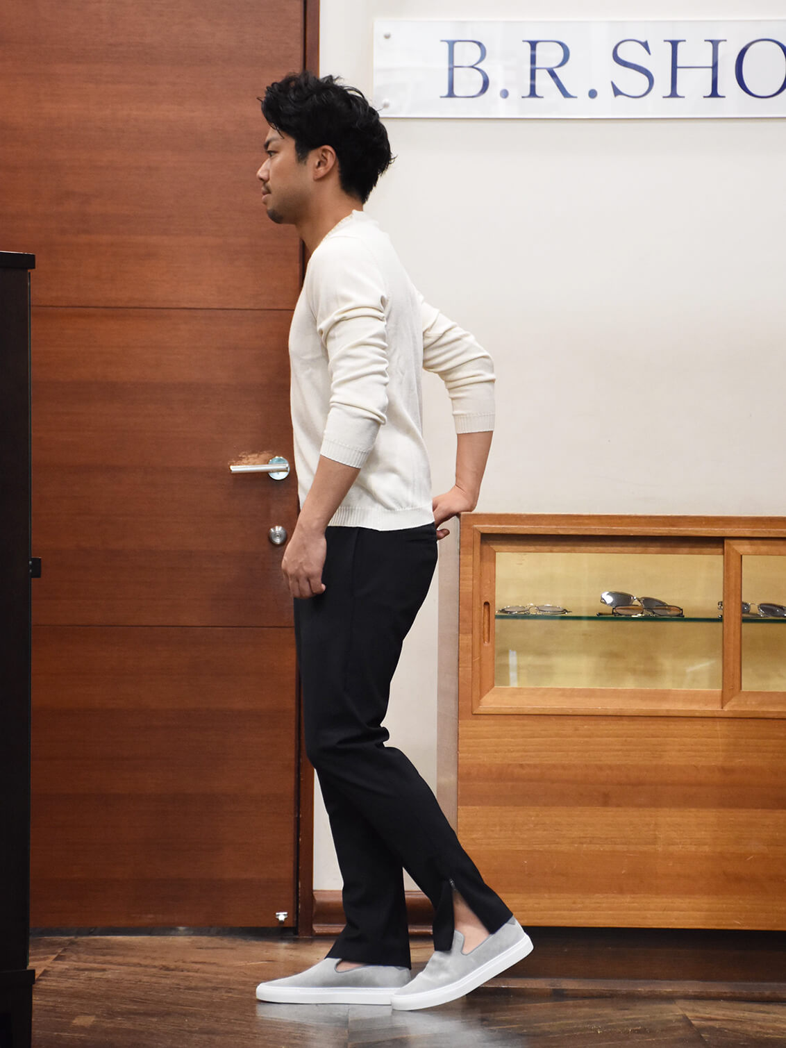 ・生地は、バイストレッチのアクティブウール。端正な綾織りでドレス顔ではあるものの、どの方向にもストレッチが効いており、実に快適な穿き心地を演出します。