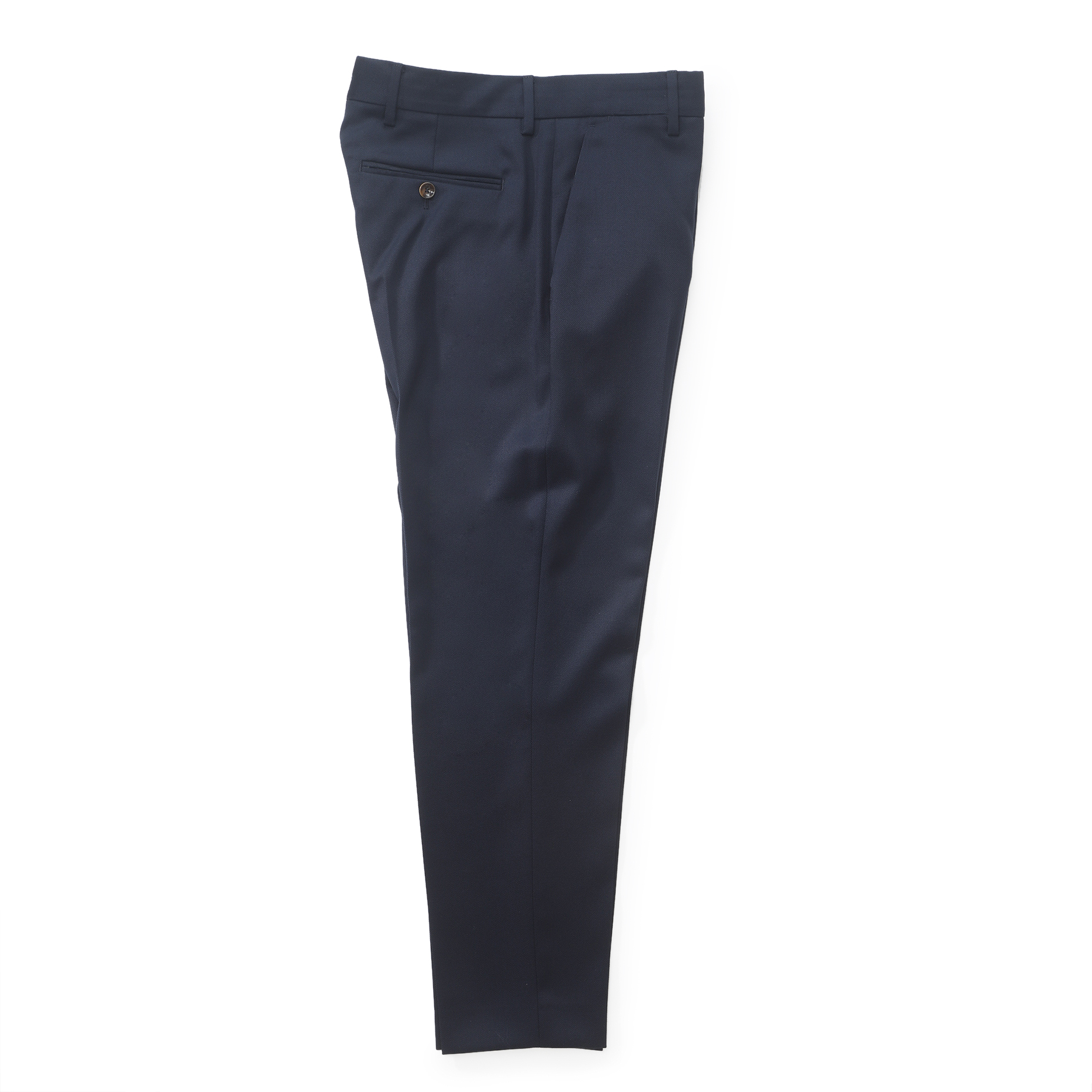 ノープリーツですが、ユルいフィッティングを味わえるこちらのモデル。ユルりとしてますが、ヒップから裾に向かって細くなっているので、綺麗な脚のラインが仕上がります。ユルめのフィッティングでありながら、綺麗なシルエットのパンツがお好きな方には是非お勧めしたい一本です!またツイル生地らしい光沢感は、上品な印象を醸します。細身体型でサイズ42を着用しジャストサイズでした。レングスは少し短めなので、足元はスッキリした印象に見えます。シャープなフォルムのシューズを合わせるのが個人的にはお勧めです!