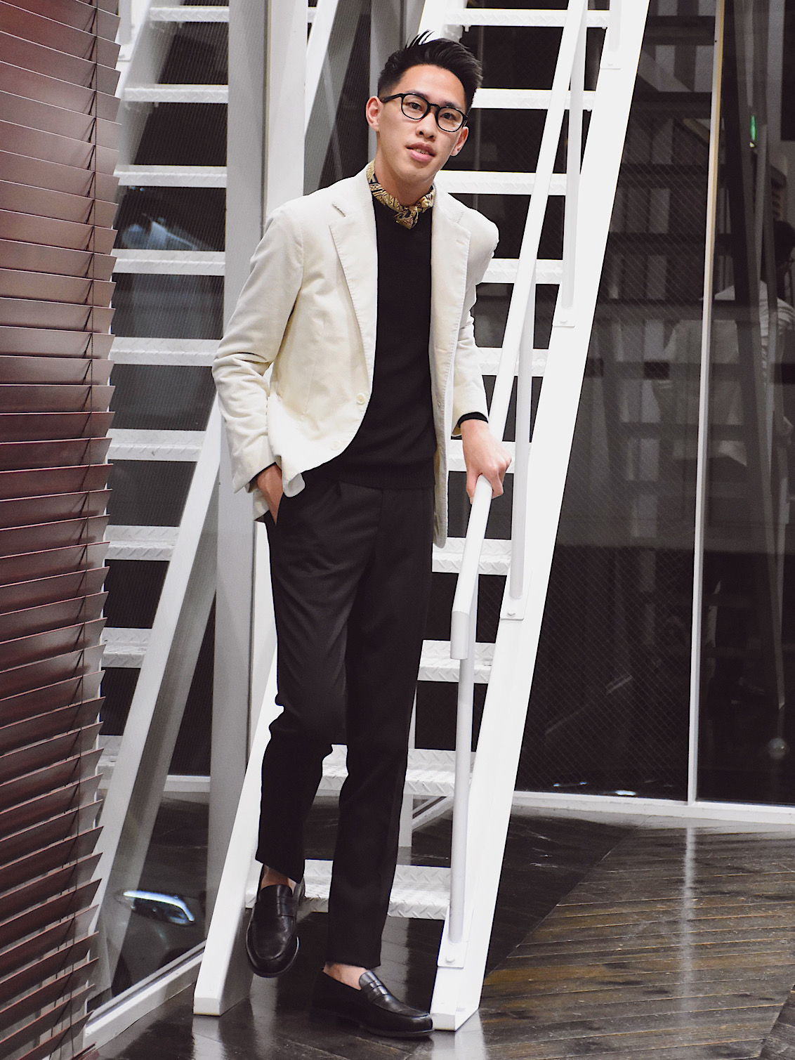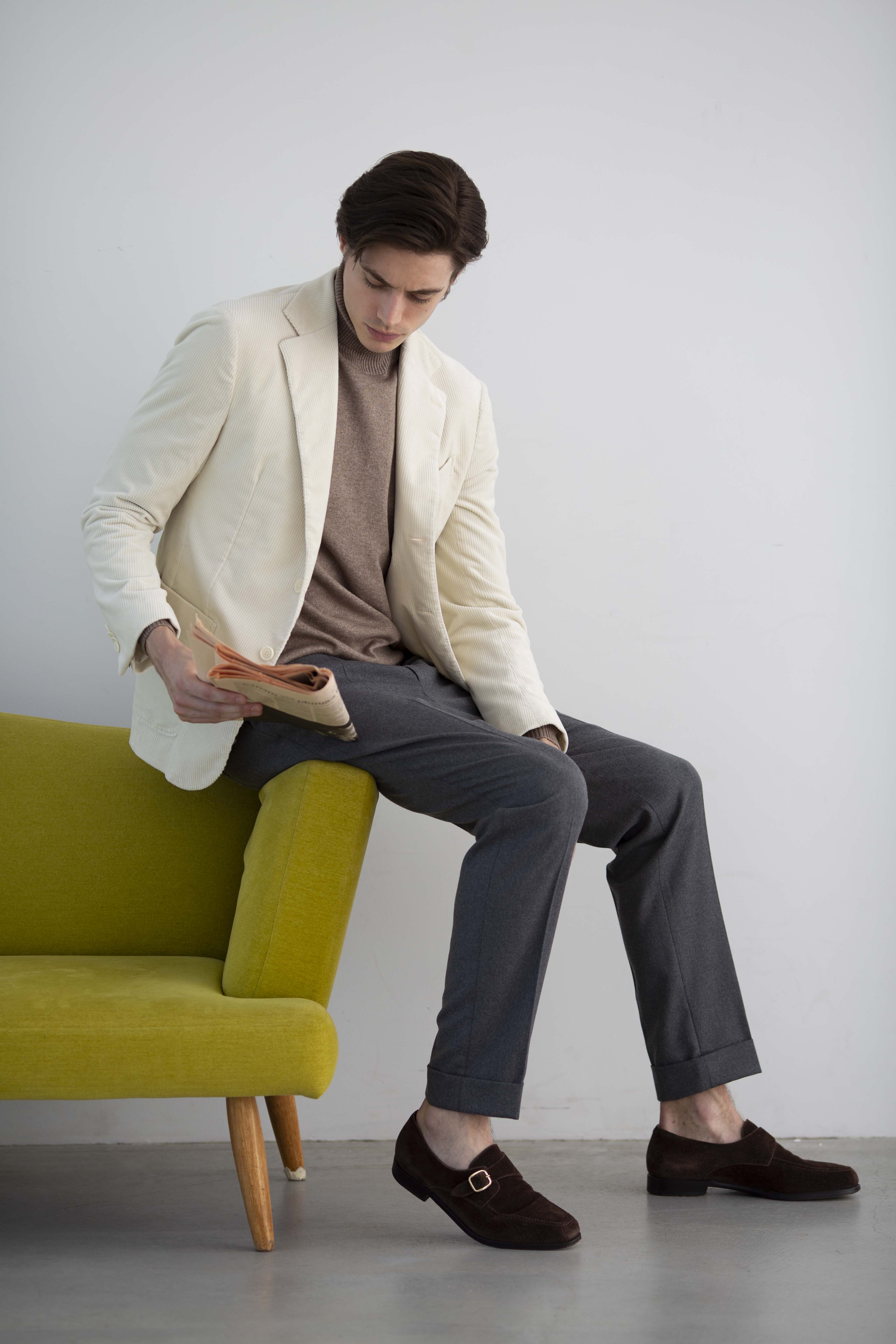 ・シャツにウール系タイ、スラックスというような正統的なスタイリングはもちろんですが、ニットやカットソーを合わせてブルゾンのようにカジュアルに着るのがオススメ!コーデュロイならではの着こなしです。襟を立てたりしても良いですね。