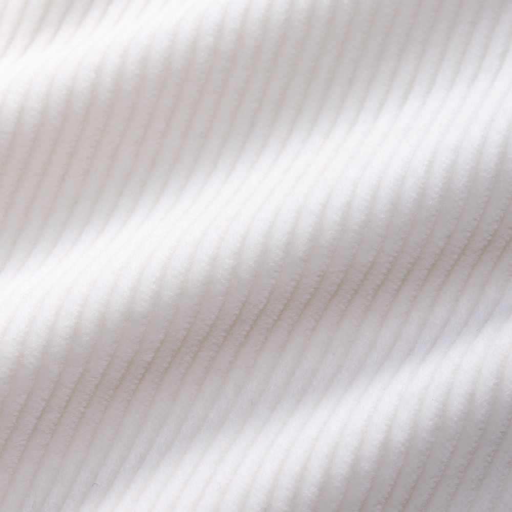 ・素朴なイメージのあるコーデュロイでもカラーがホワイトになれば実にモダンな見え方に。やや細畝で微光沢感のある上質なストレッチコーデュロイです。軽くて柔らかなので、羽織るように着て頂けます。目付は345グラム。カラーは他にブラックもラインナップ。