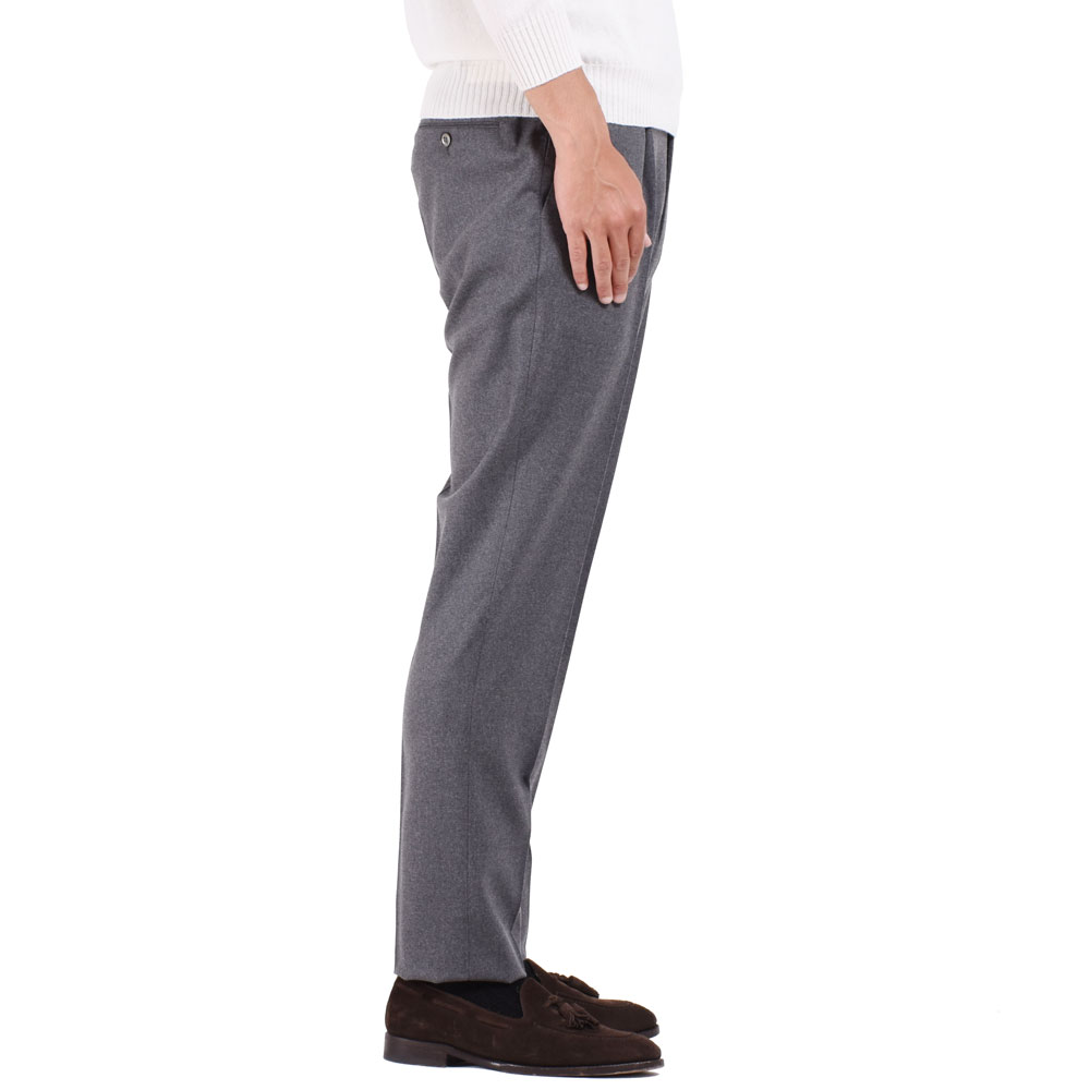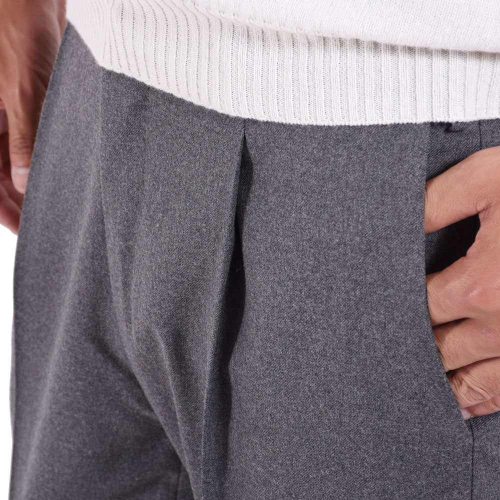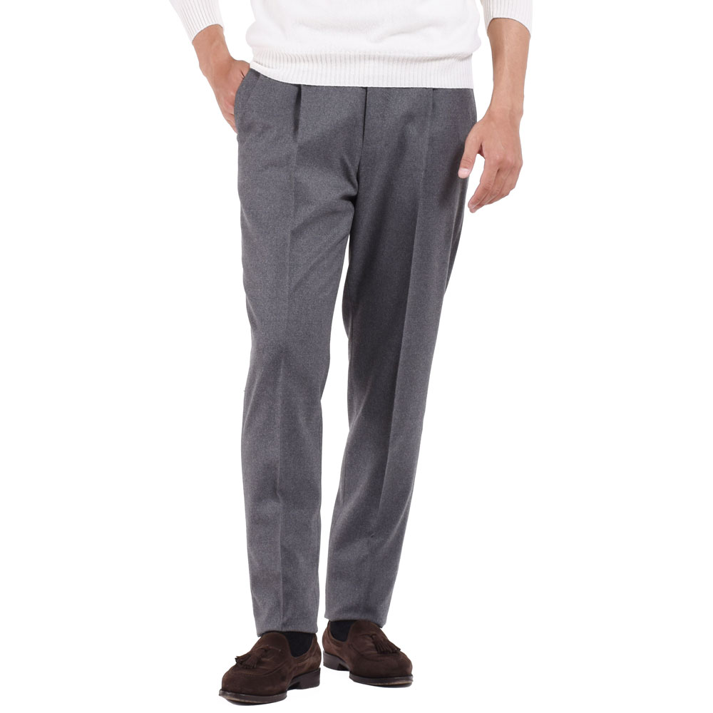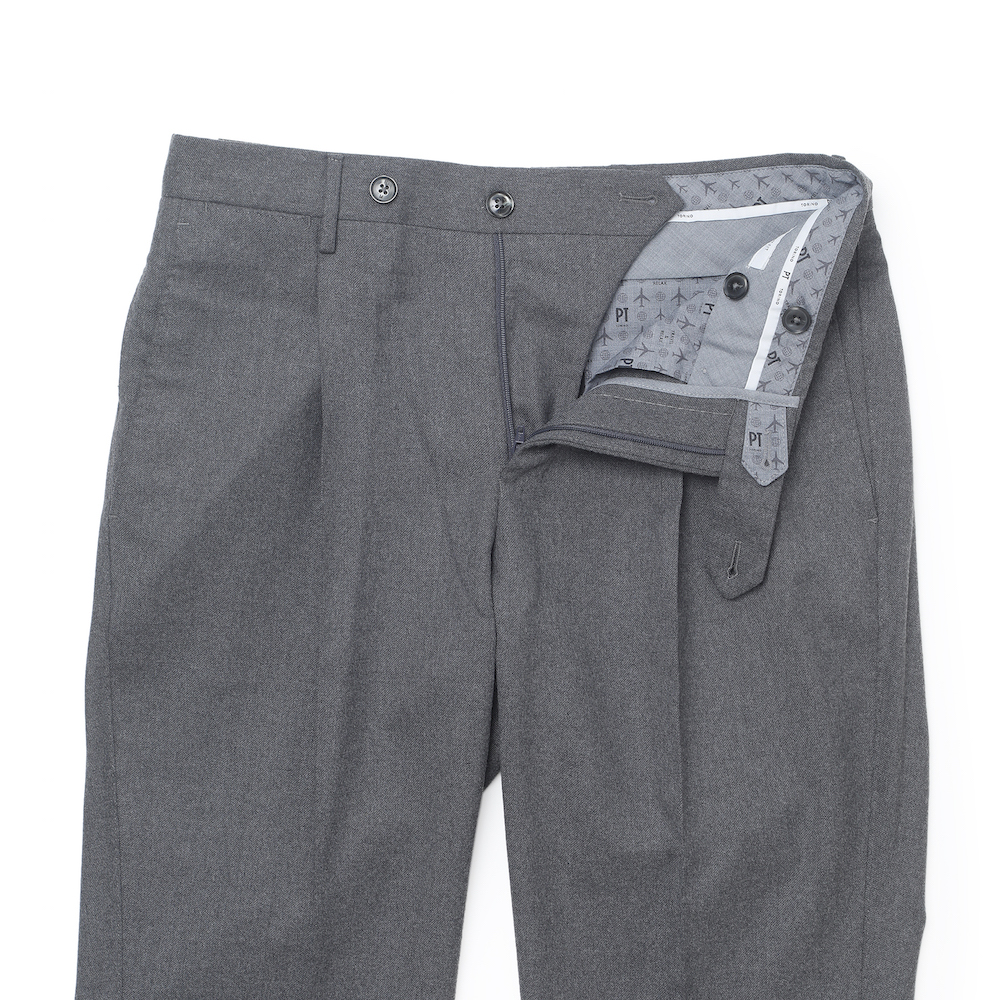 ・「PT TORINO(ピーティートリノ)」を代表するモデルである"GENTLEMAN FIT"はドメニコ・ジャンフラーテ氏がディレクターとなって生み出したもの。しっかりと確保された股上寸によって腰廻りのホールド感が良く、プリーツの入ったやや余裕ある腰廻りとテーパード感あるシルエットが特徴です。このような絶妙バランスがゆえ、もちろんジャケットに合わせられ、足元はスニーカーなど、どんなスタイルでもエレガントさをキープできるのです。