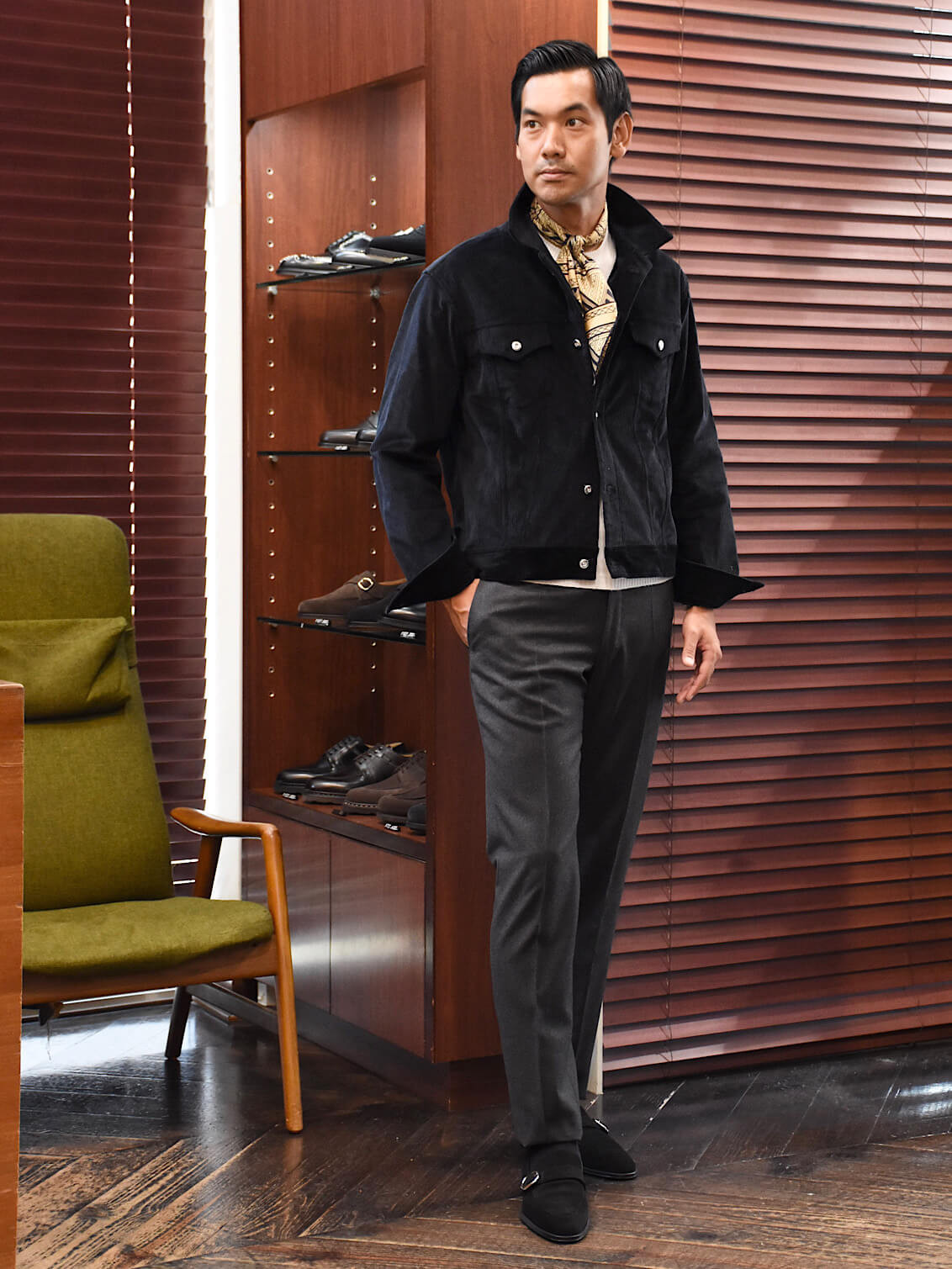 ・リラックス感あるシルエットゆえ、気楽に羽織れ、軽くてスタンダードなデザインが◎。BRでは通常このモデルには載らないシルバーボタンをリクエスト。さりげなくラグジュアリー感を漂わせました。同じ生地を使ったジャケットもラインナップ。