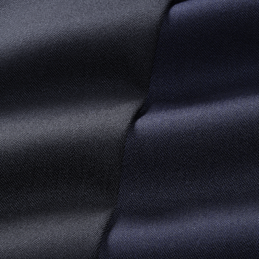 ・こちらは"VOYAGE TRAVEL WEAR"と名付けられた生地で、二方向ストレッチ、マシンウォッシャブル、しわになりづらく、防汚加工と撥水加工が施された機能的なもの。エレガントなシルエットとともに快適な穿き心地とイージーケアも備えます。目付は450グラム。