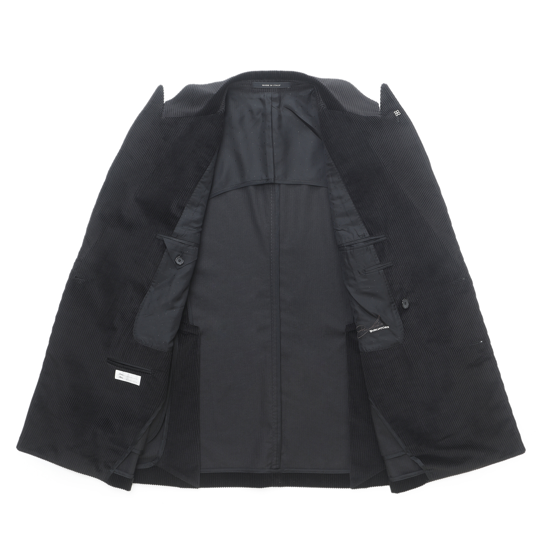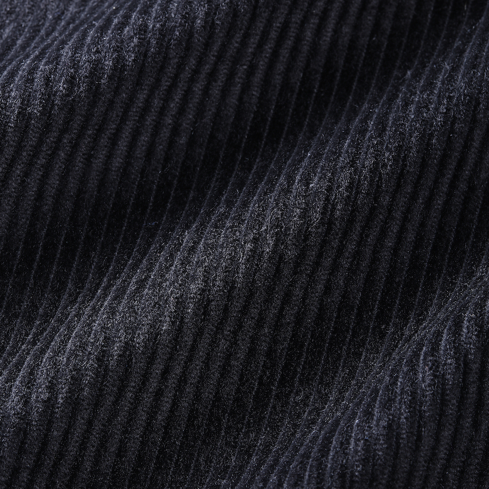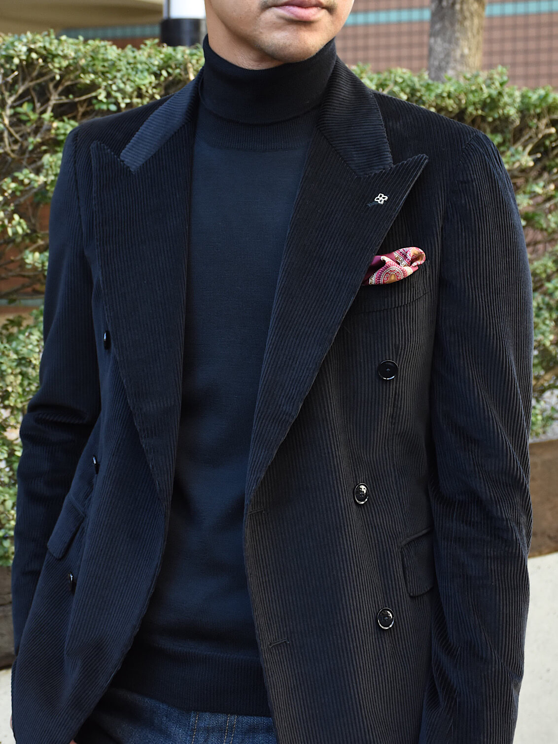 ・モードなムードを活かすべくBRがセレクトしたのはブラックコーデュロイ。黒という色合いによってモードなデザインが引き立てられるだけではなく、カシミア混なのでラグジュアリー感もプラスされています。目付は325グラム。袖ボタンは通常と異なり5個づつ付けられるようになっており、ディテールにも抜かりはありません。
