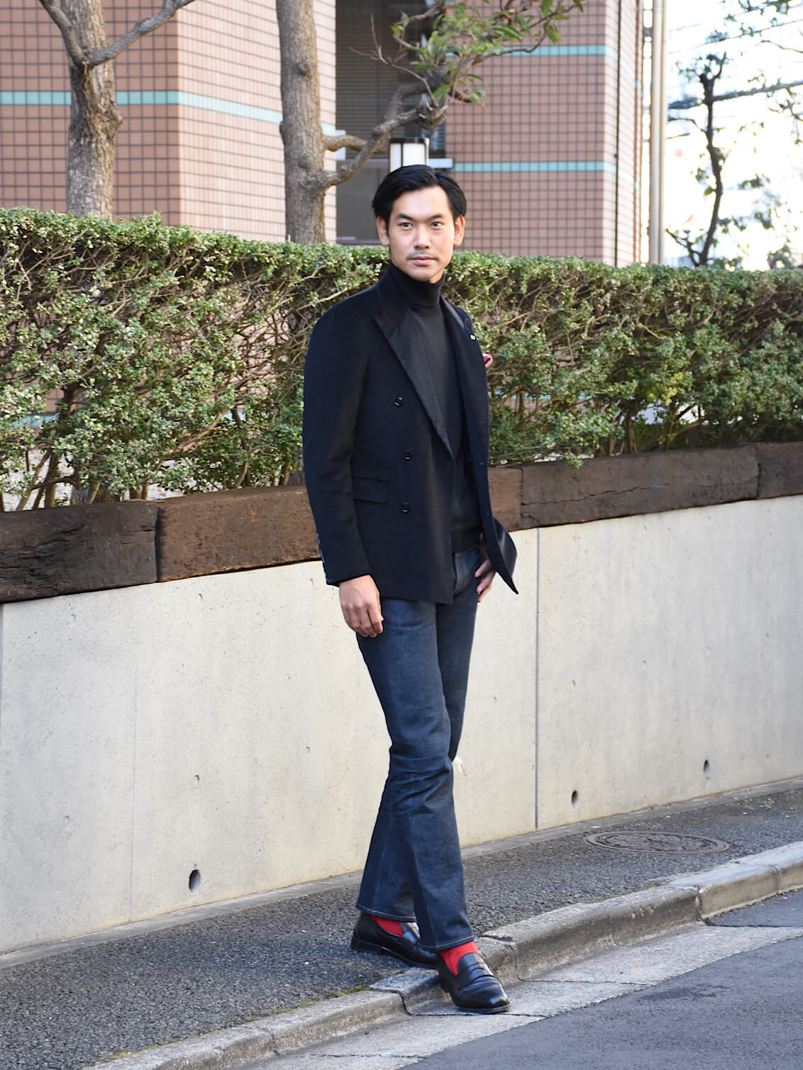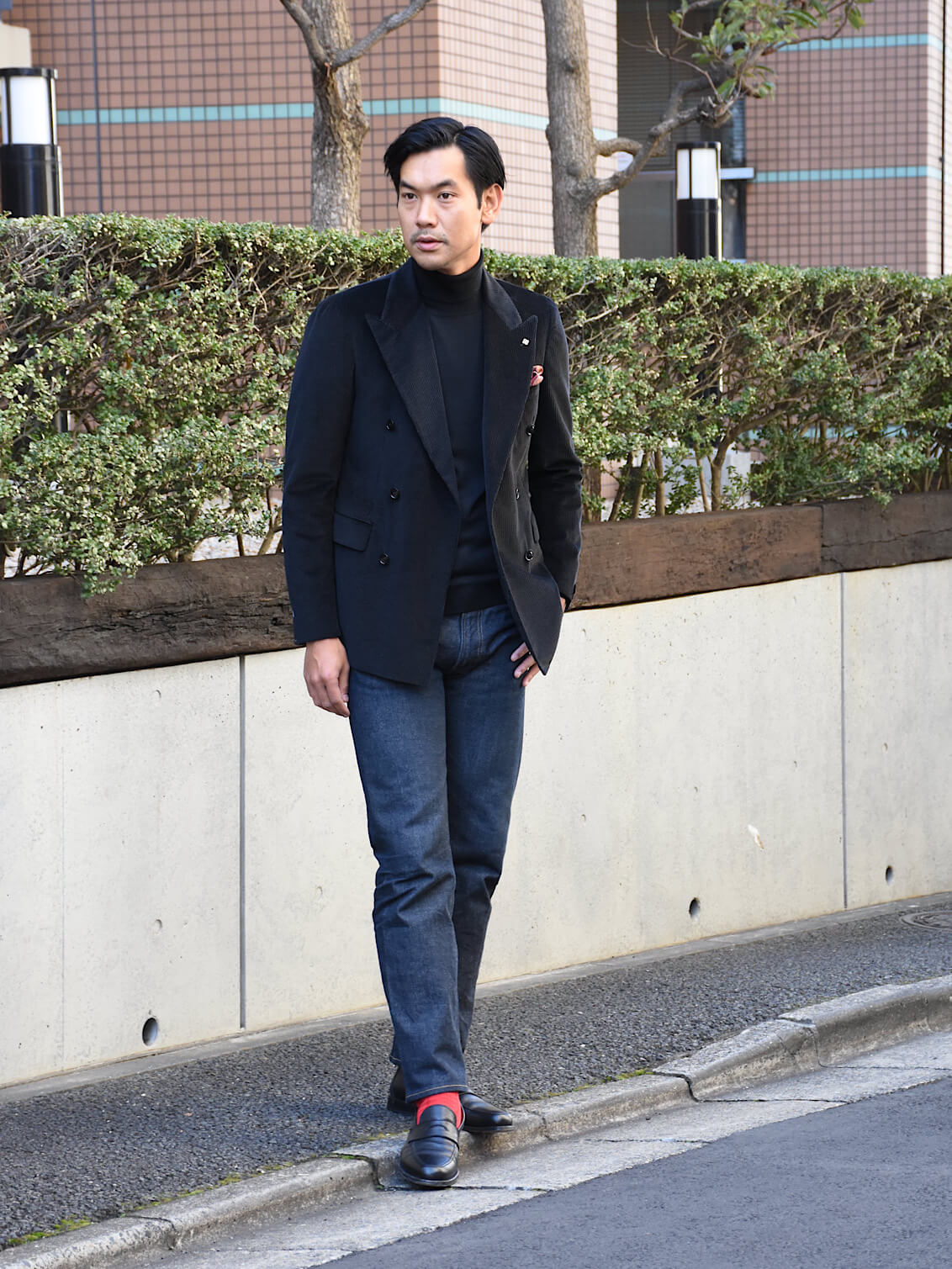 ・早い方ではもう取り入れているかも!のラペルのゴージ位置、そしてボタン位置がやや低いダブルブレステッドジャケット。一般的にはクラシカルなムードを醸すデザインになりますが、ピーノさんが手掛ける「TAGLIATORE(タリアトーレ)」のソレはひと味違います。クラシカルではなくモダンに映る絶妙なゴージラインやボタン位置によって、モード感ある仕上がりに。