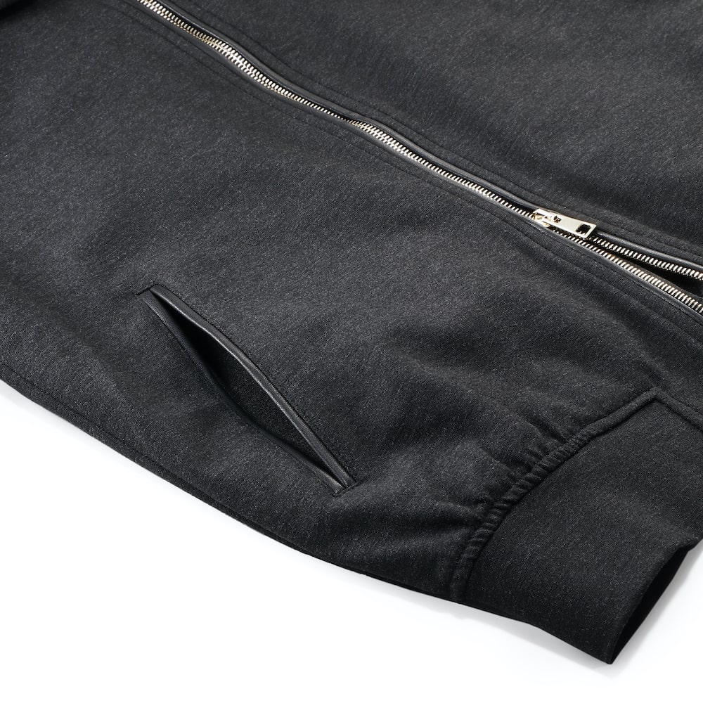 これ1着でラグスポスタイルが仕上がります!スポーティなパーカーではございますが、こちらのBR別注はジップや細かなパーツをゴールドにしたり、フェイクレザーのパイピングを施したりなど、パーカーにラグジュアリーな要素を加えており、見ただけでリッチ感あるオーラを醸す1着に。生地はジャブスでは定番のスタンダードジャージを使用。ハリ感がありながら伸縮性は抜群なのです!また、台襟が付いておりジップを上まで閉めた時に、襟が立つようになっており、クールな印象がございます。