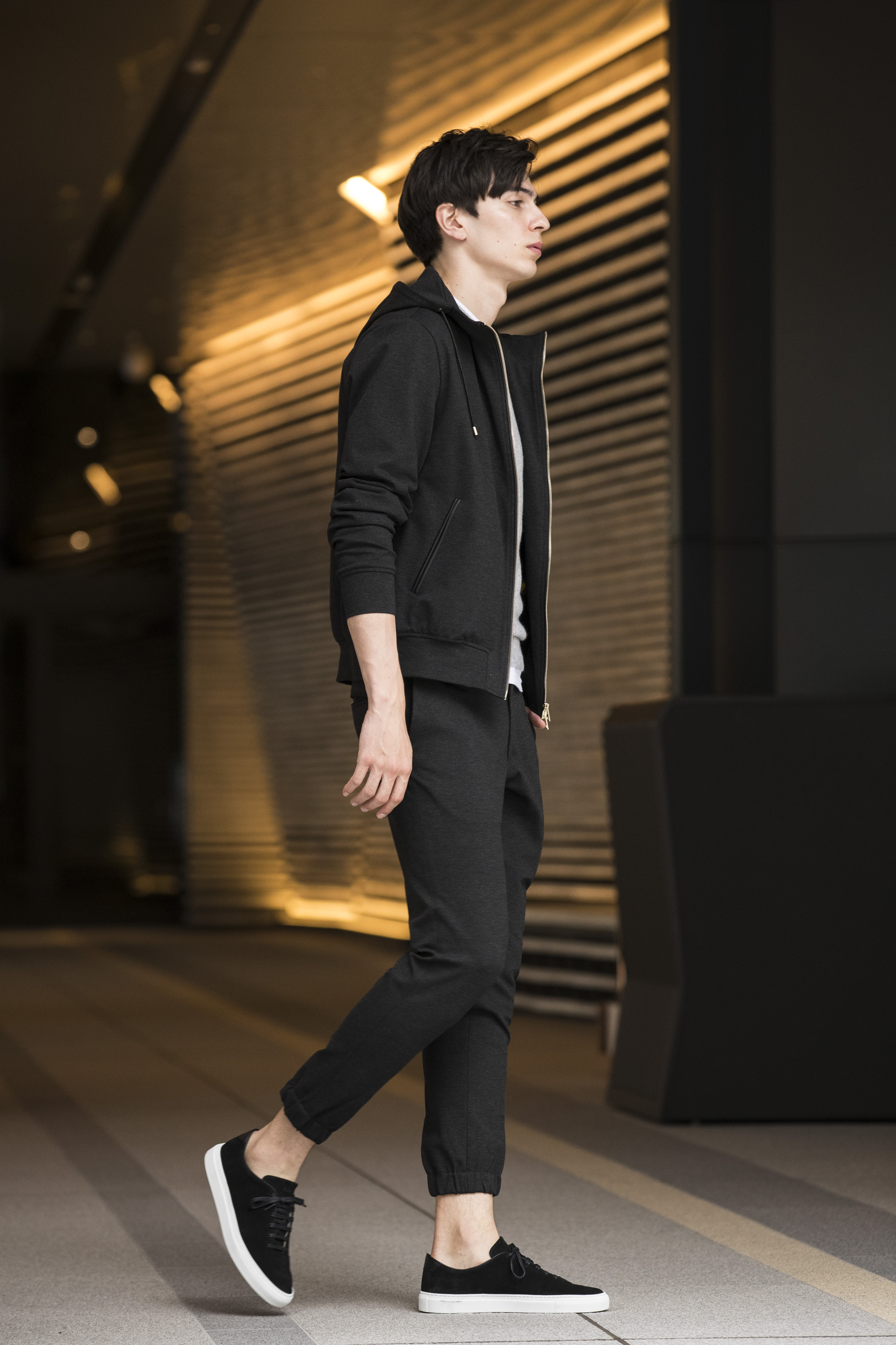 ・カラーは、ブラック、ホワイト、チャコールグレーをラインナップ。セットアップとなる組下パンツは、スマートな"MASACCIO"、ちょいユルな"TINTORETTO"、スポーティな"GIORGIONE"の3モデルをご用意しました。お好みで自由にパンツを組み合わせることができます(GIORIONEのみ2色展開)。