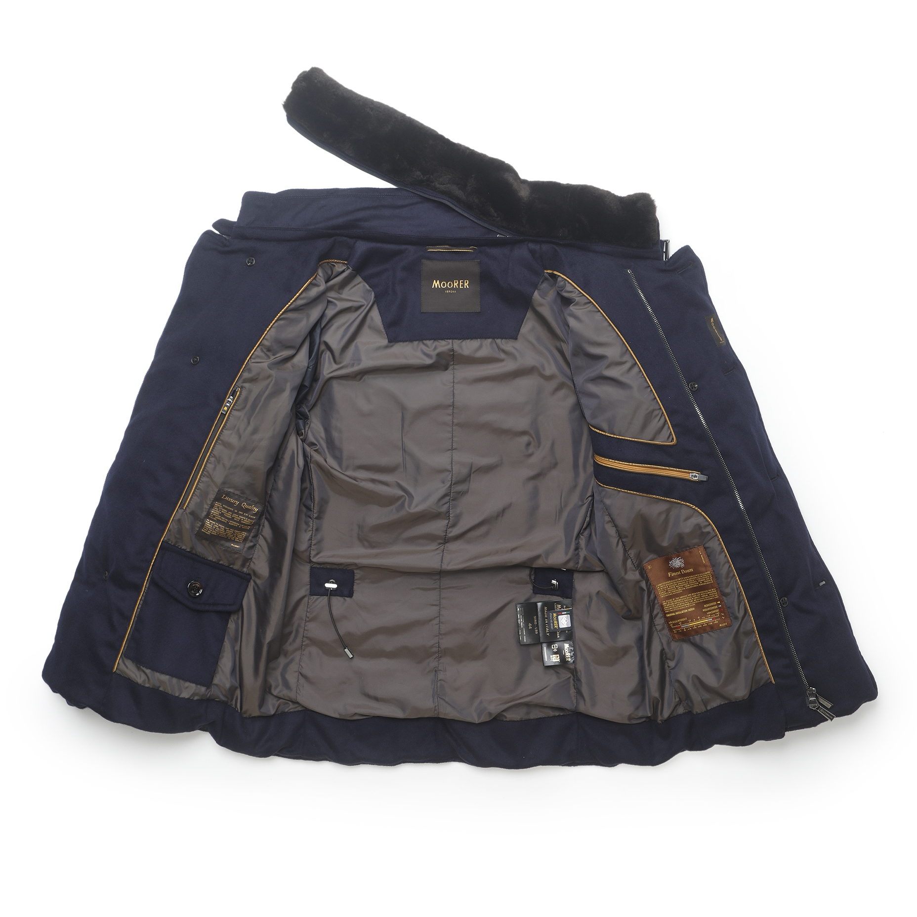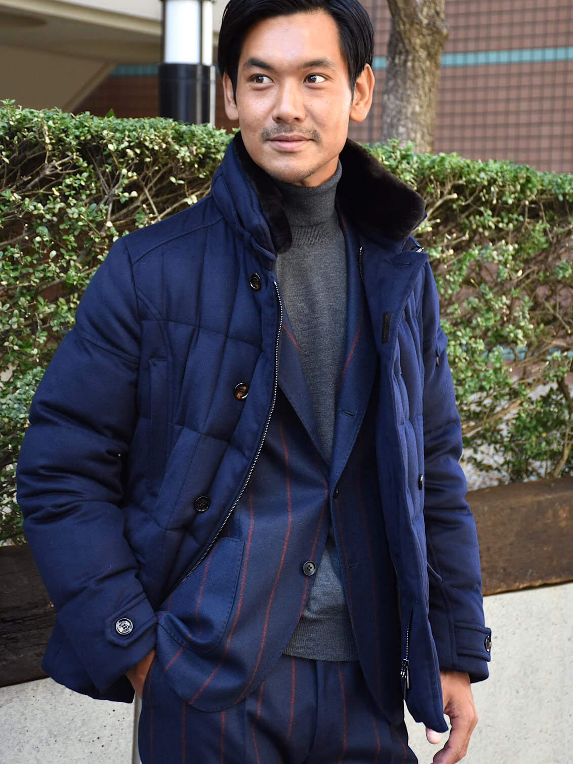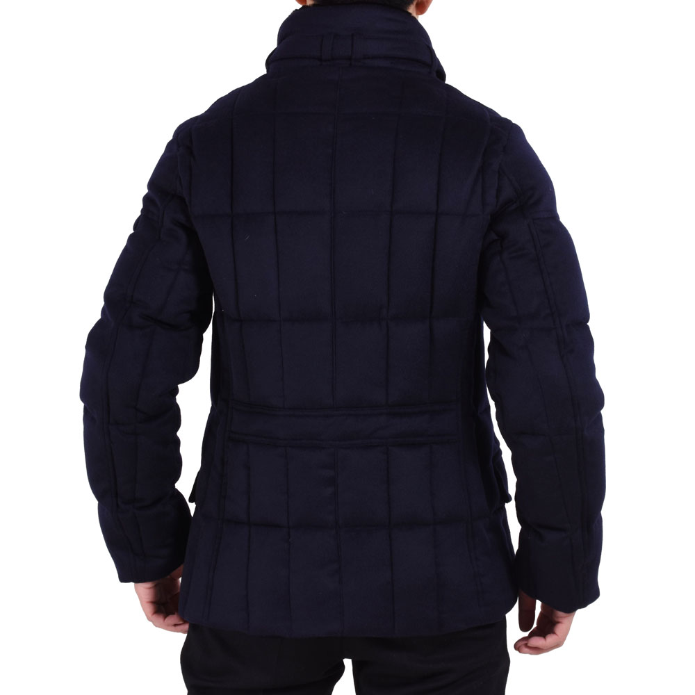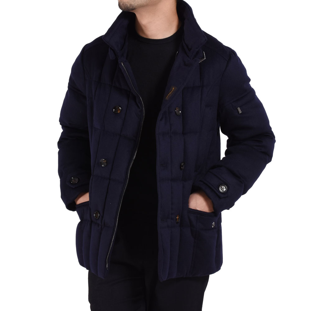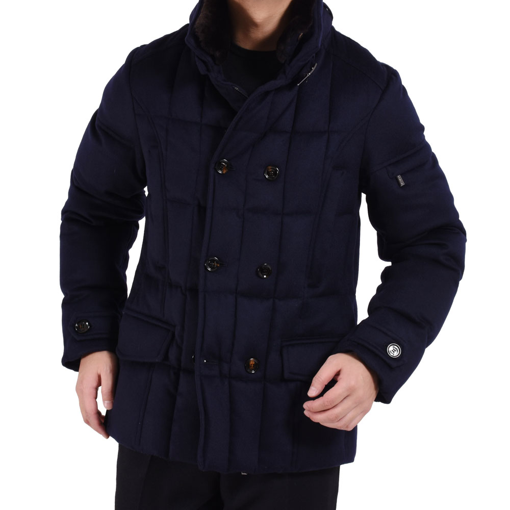 ・同じモデルでも表地や襟のファーにより価格が異なるのが「MooRER(ムーレー)」の特徴で様々な"SIRO(シーロ)"が存在します。ご紹介するのは最上級モデル!見るからにラグジュアリーな表地はウール&カシミア。ビーバーのような仕上げになっており、カシミア混率10%とは思えないほどのぬめり感と品の良い光沢を備えています。またネイビーの色出しの美しさも特筆すべき点です。