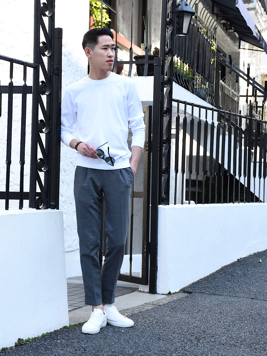 ・ホワイトを着用し、ライトグレーのパンツにスニーカーを合わせたスタイル