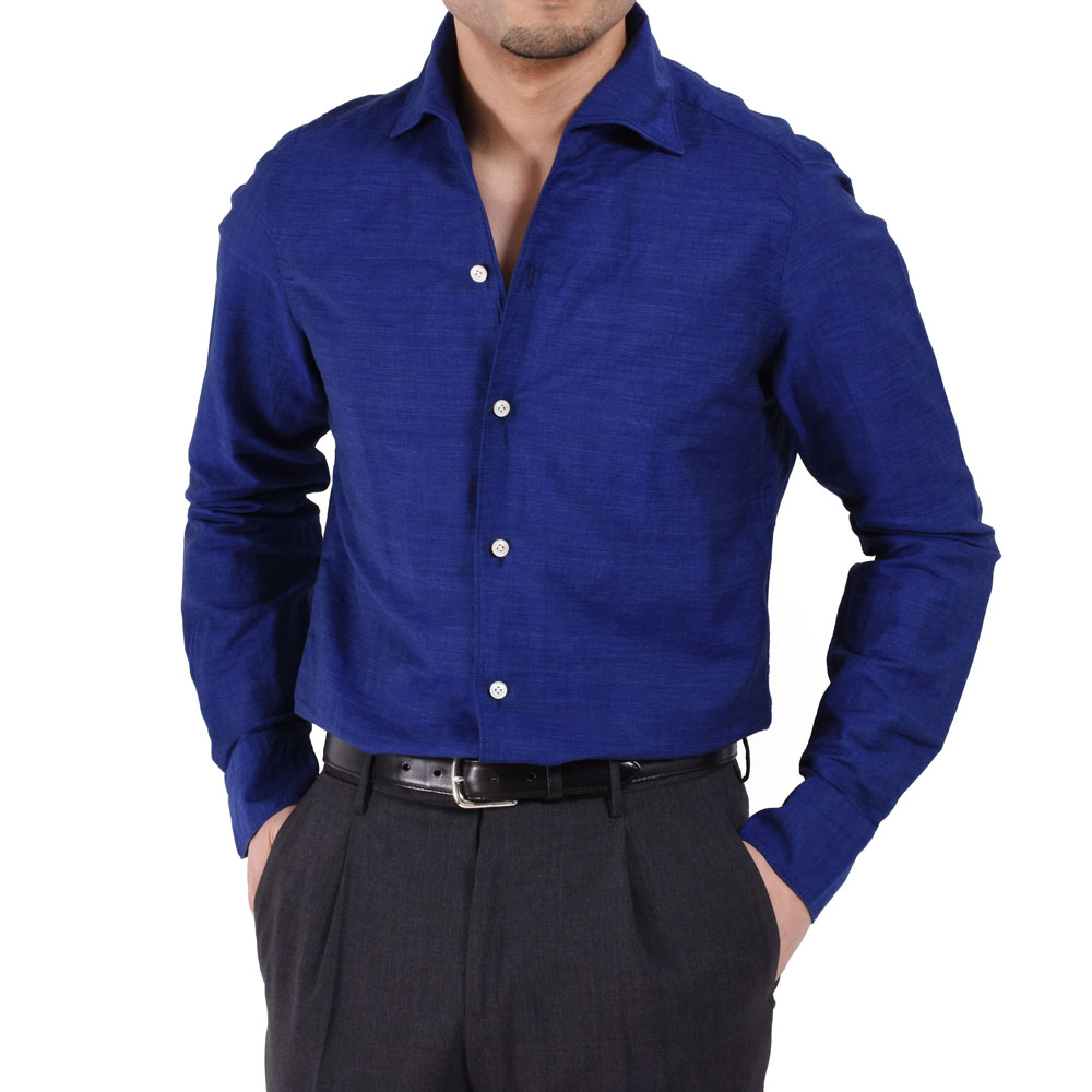 ・襟型はカジュアルでありながら品の良さも醸せるワンピースカラー。リラックス感ある襟の開き方と通常よりも生地を多く使うためラグジュアリーな襟型として知られています。こちらは表からは見えない隠しボタンダウンとなっている「Finamore (フィナモレ)」こだわりの仕様。気分によって隠しボタンダウンのボタンを外して着ても全く問題ありません。フロントのトップボタンがあえて付けられていないのはナポリの粋ですね。