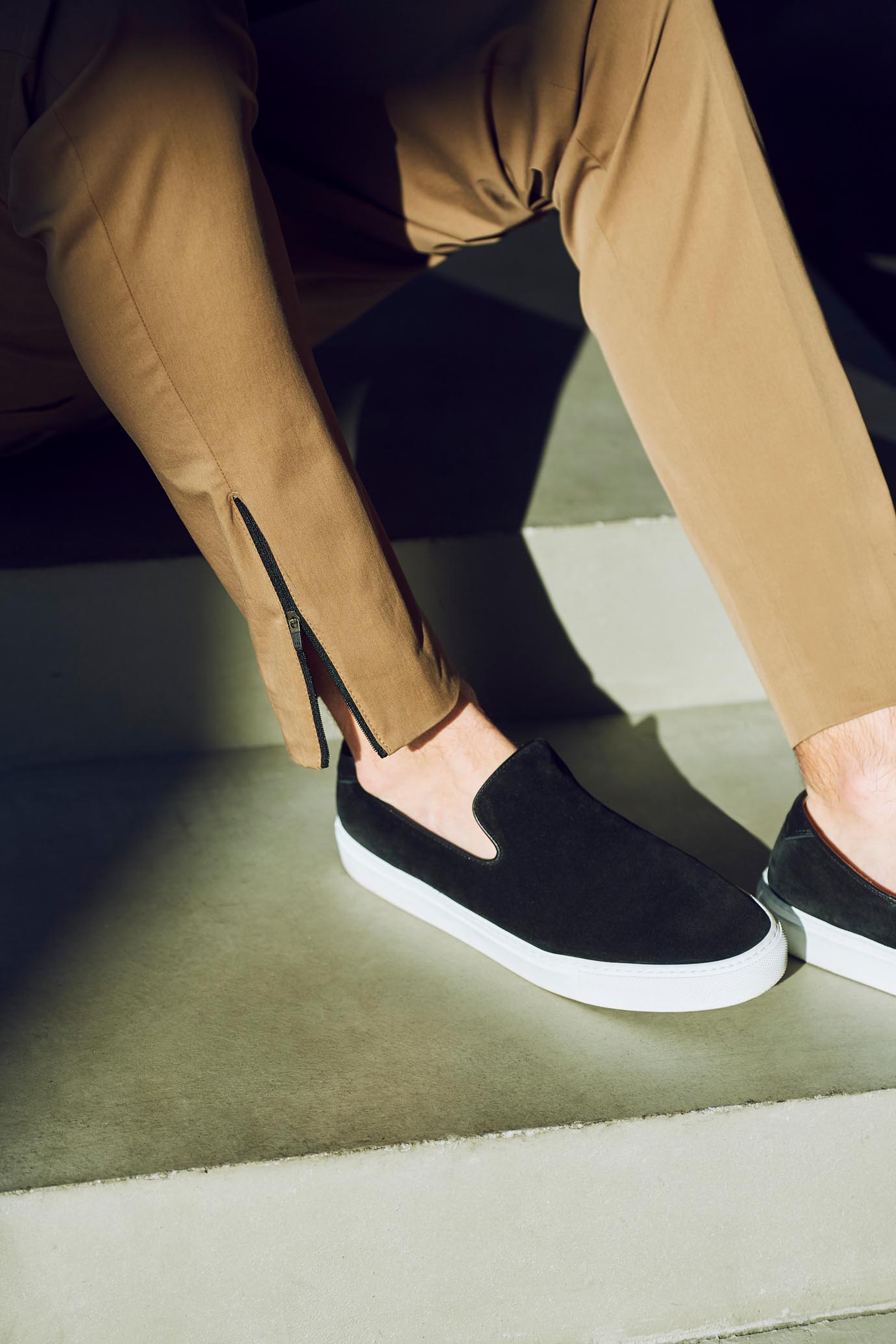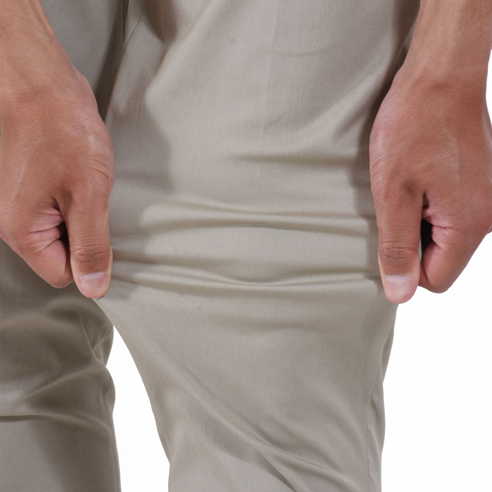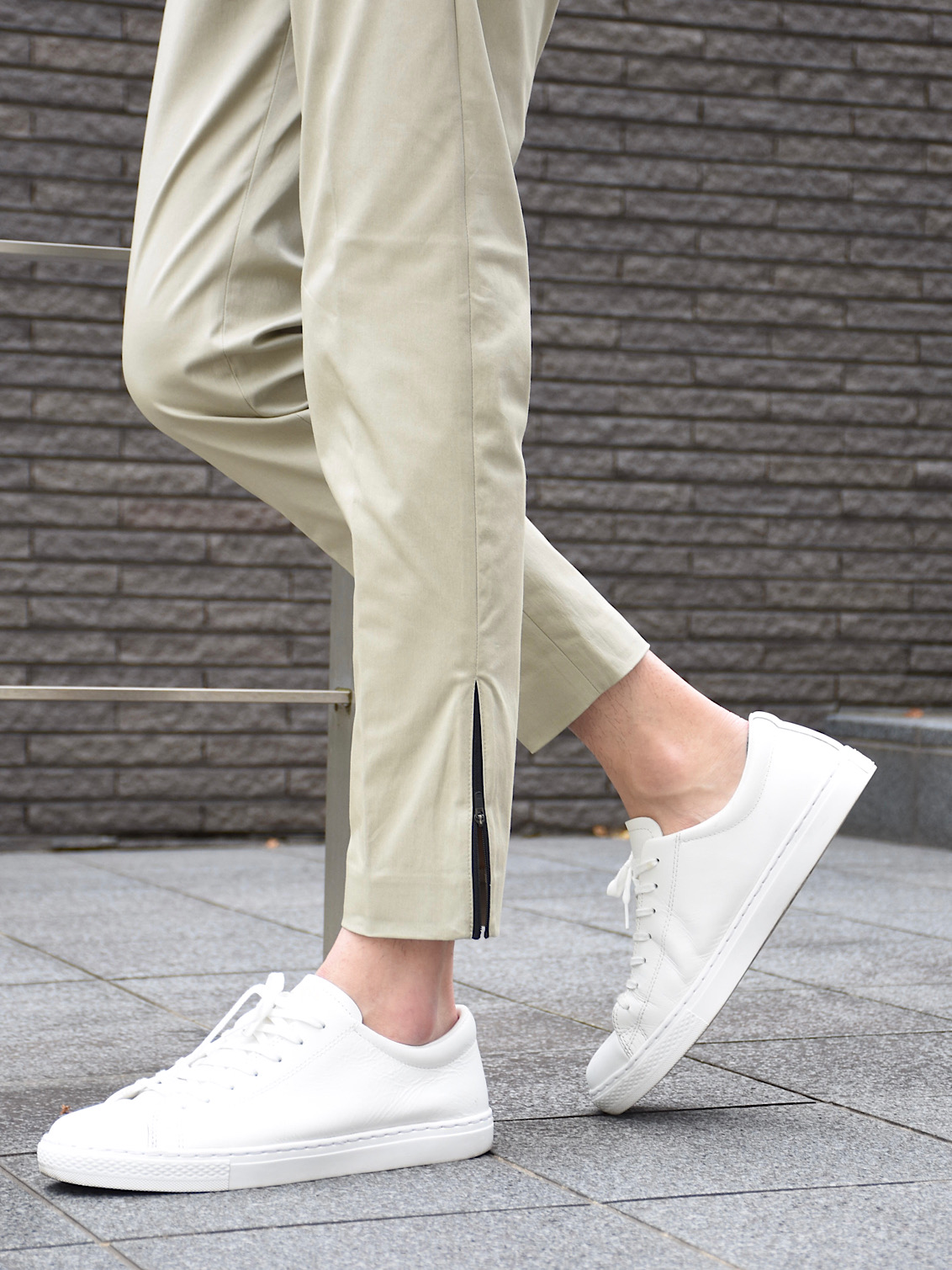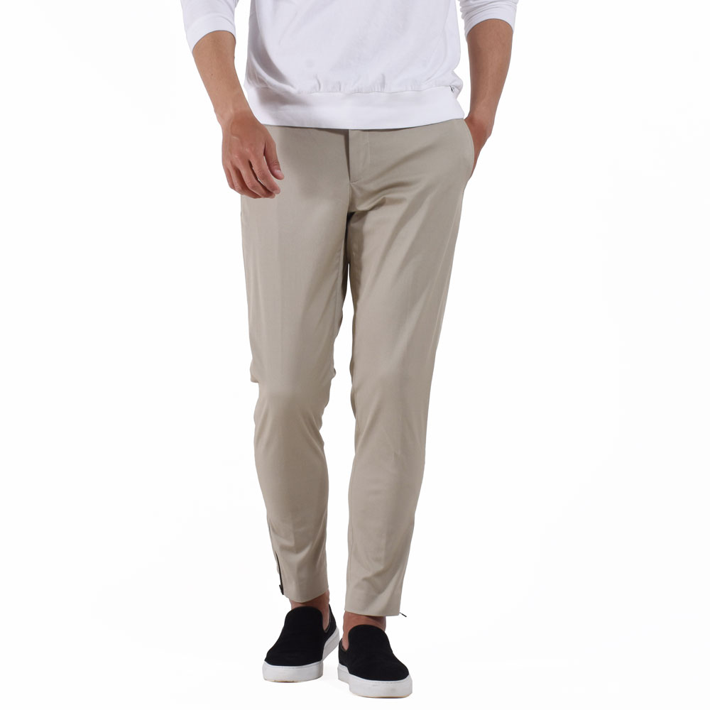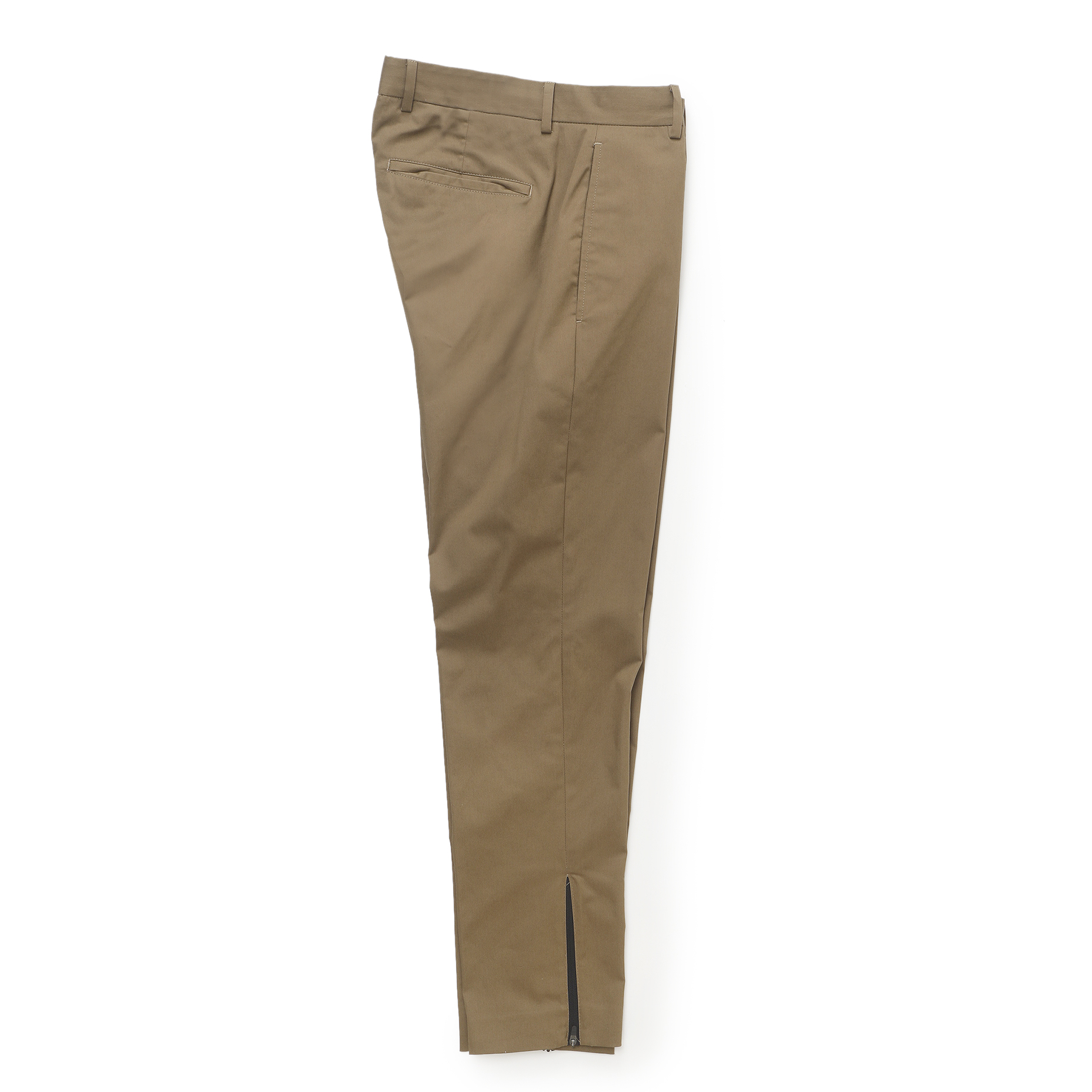 サラッとしたテクノコットン生地は暑い夏でも快適に着用頂けること間違いなし!ノープリーツでシンプルなデザインながら、裾のジップがアクセントに。ニュアンスを付けて穿きこなして頂くのが◎僕は普段自転車に乗る事が多いのですが、このような裾幅が細いパンツはそんなシーンにもピッタリだなと感じました。チェーンなどにも擦れないですし、もちろん暑いな〜と感じた時はジップを開けば風も入ってきて快適なんです!僕のライフスタイルにぴったりなんで、本気で欲しい!!