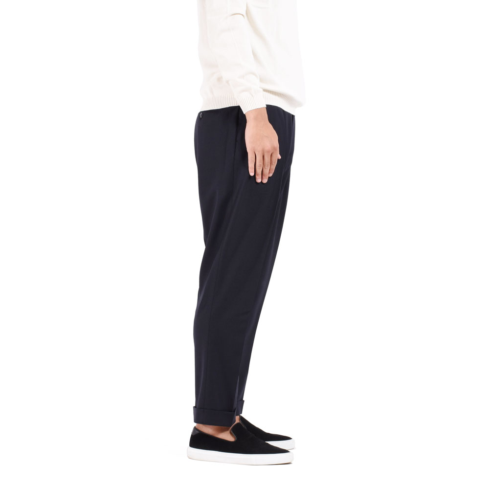 ・安定感ある股上の深さ、ワタリはゆとりがあるもののテーパード感の強いシルエットに仕上げられており、センタークリースが入っていることもあり、締まりがありつつリラックスしたシルエットと穿き心地が楽しめます。