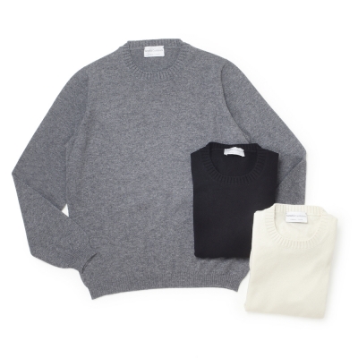 クルーネックですが、首回りが詰まらず収まりがいいのと、1枚で着てもサマになるニットです。