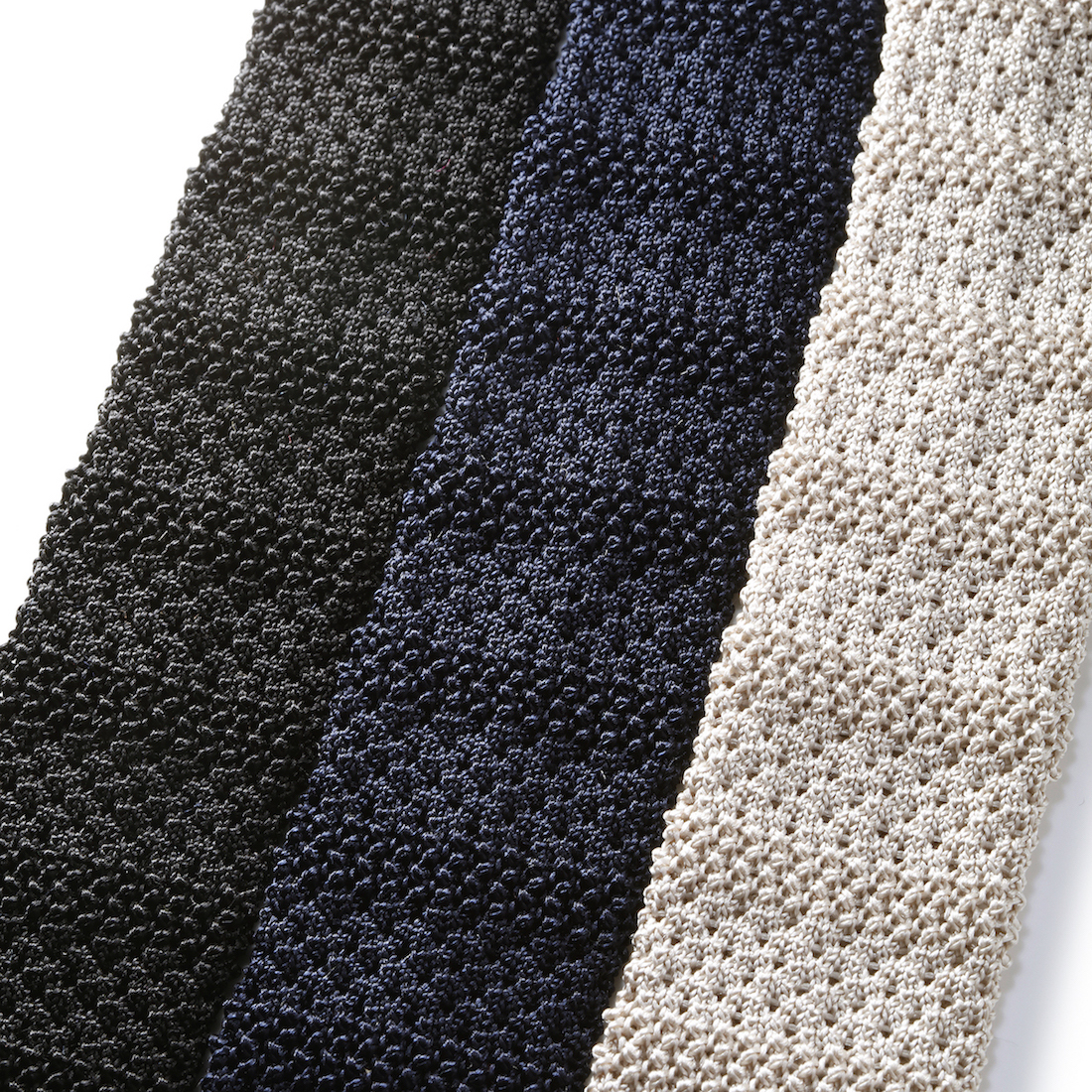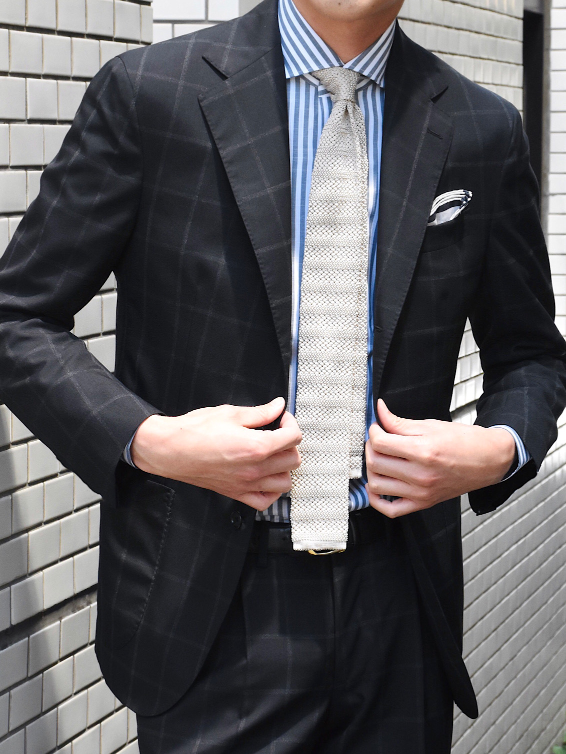 このニットタイは、自信を持ってオススメします!ニットタイは軽くひらひらしたり、厚手でノットがぽってりする物が多く、綺麗に巻くことができない物が多いのであまり好んで巻きませんが、こちらのニットタイは違います。しっかりした生地で、握るとキュキュと生地が鳴き(良いニットタイの証です)、非常に巻きやすくノットも作りやすいです。