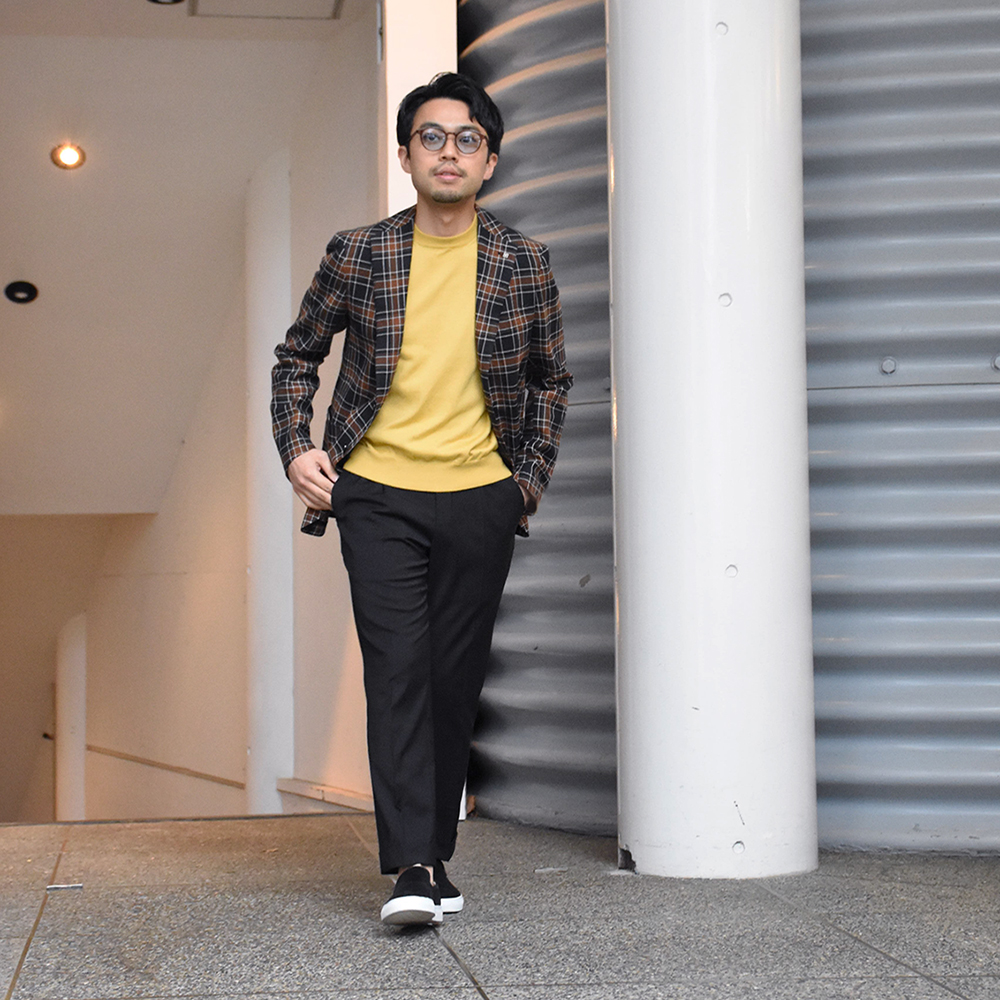 細身体型でサイズ46を着用。