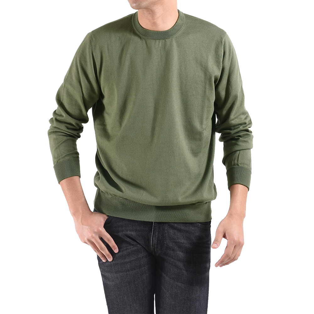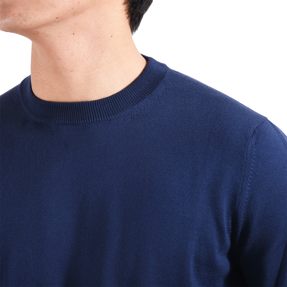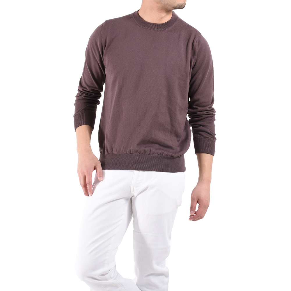 ・目の詰まったカジュアル感ある風合いから通称"スウェット風編み地"と呼ばれ、着れば極上のリラックスムードを醸す今の時代感にピッタリな編み地です。その編み地を使ったクルーネックに上品さを加えるべく、ネックリブ幅を細め(およそ2.5センチ)に別注しました。