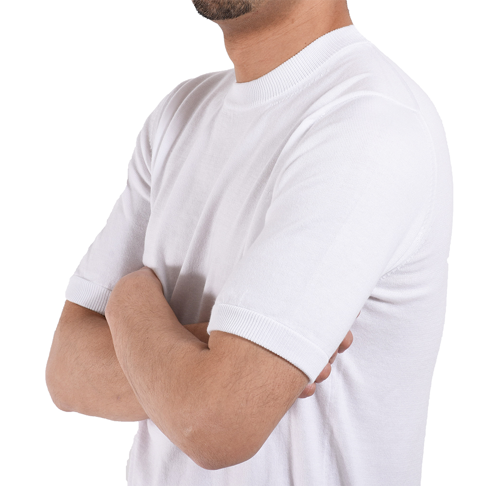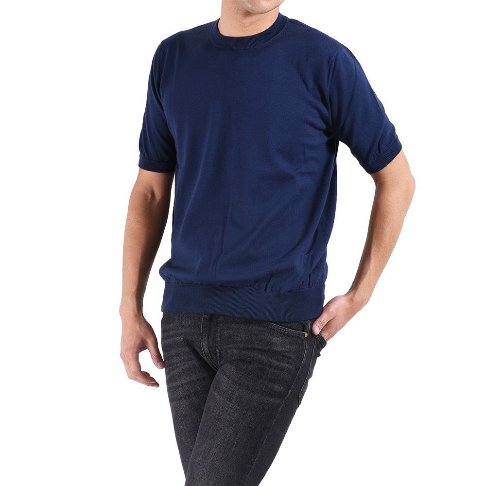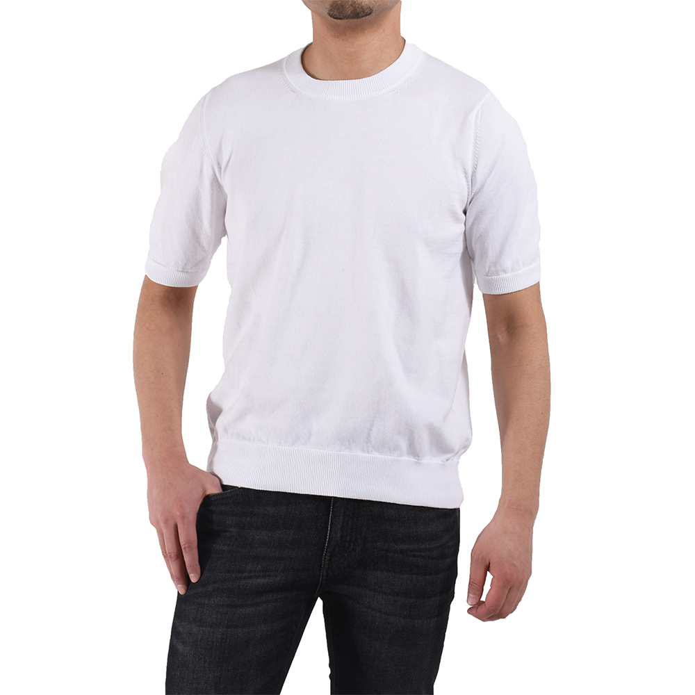 ・目の詰まったカジュアル感ある風合いから通称"スウェット風編み地"と呼ばれ、着れば極上のリラックスムードを醸す今の時代感にピッタリな編み地です。その編み地を使った半袖ニットTに上品さを加えるべく、ネックと袖のリブ幅を細め(およそ2.5センチ)に別注しました。