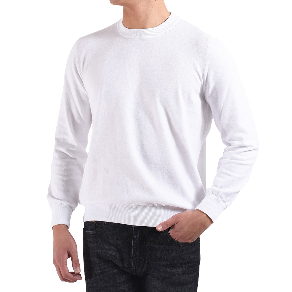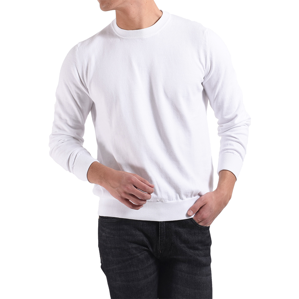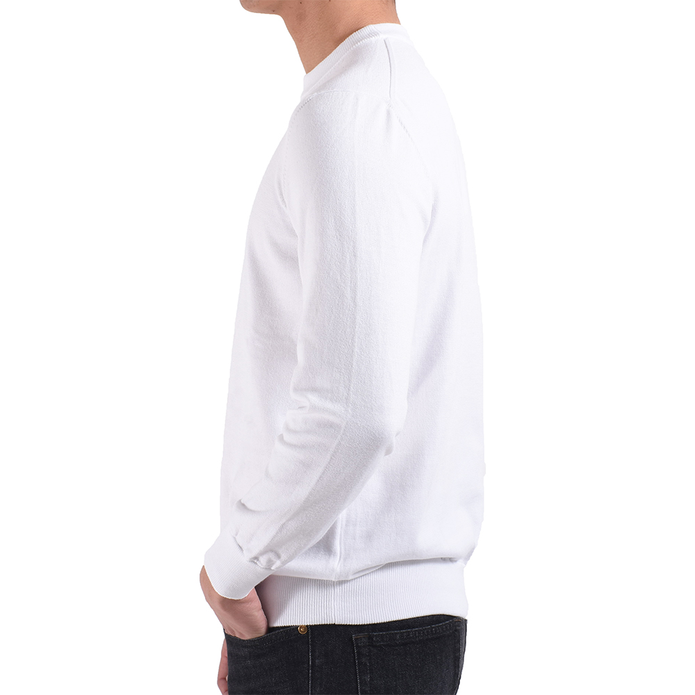 ・目の詰まったカジュアル感ある風合いから通称"スウェット風編み地"と呼ばれ、着れば極上のリラックスムードを醸す今の時代感にピッタリな編み地です。その編み地を使ったクルーネックに上品さを加えるべく、ネックリブ幅を細め(およそ2.5センチ)に別注しました。