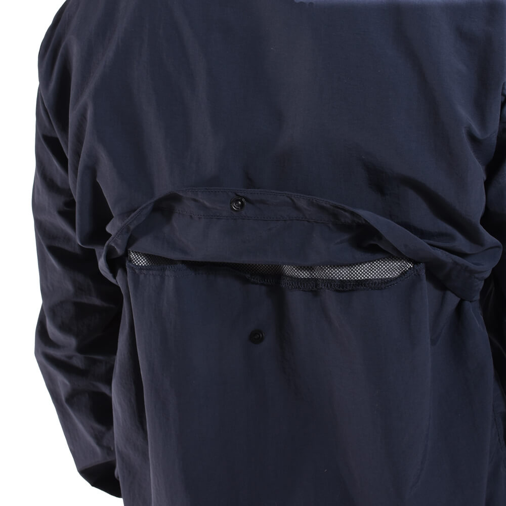 ・背中上部は表地とメッシュ裏地の二枚仕立て。サラリとした着心地を実現するとともに雨などが染みづらいという機能性も持たせています。