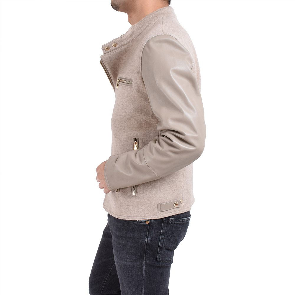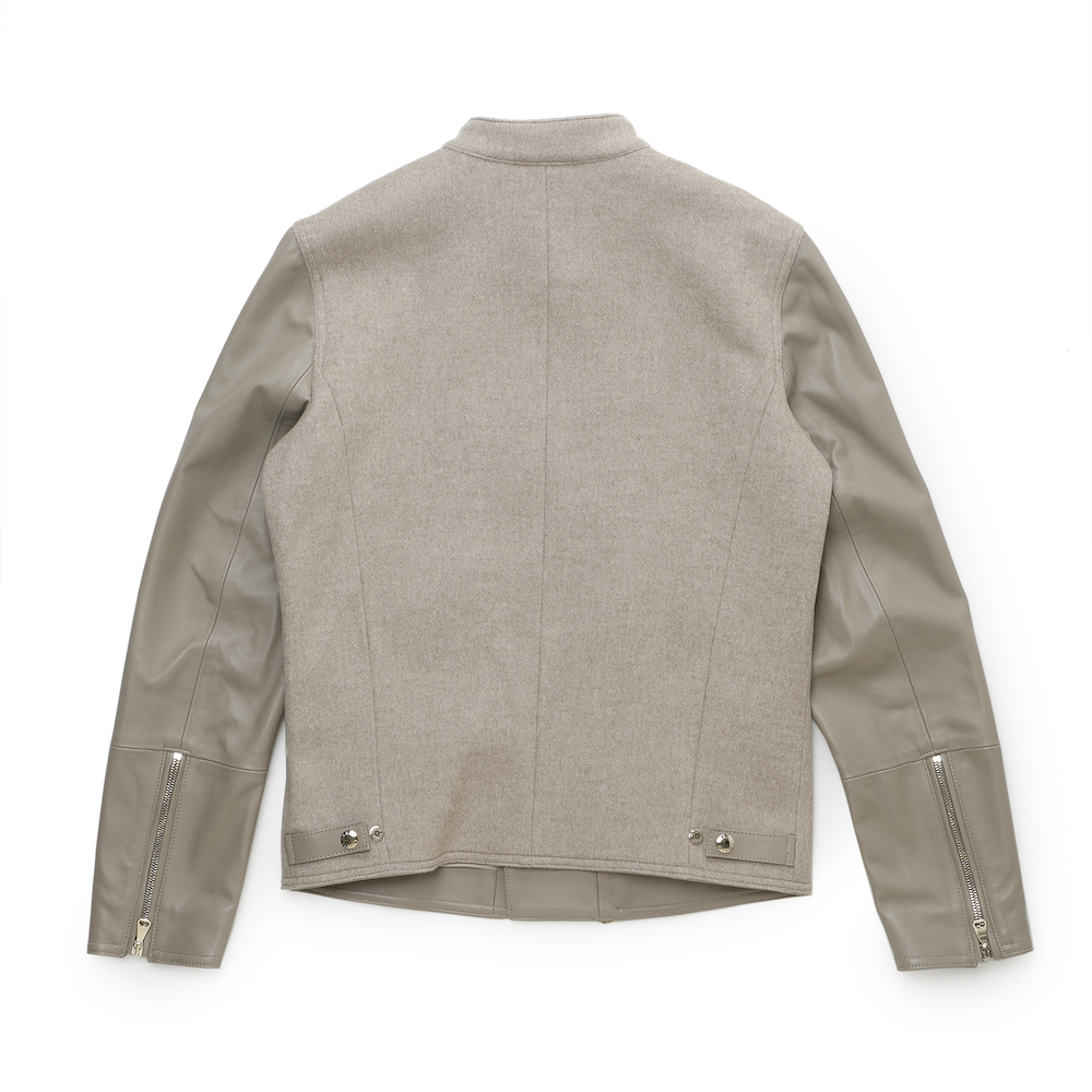 ・フィッティングは、ダブル合わせゆえにタイト過ぎない着心地。スマートなシルエットはもちろん健在で、袖やポケットのジップ、襟元や裾のスナップボタンは、ライトベージュ/ゴールドとブラック/シルバーにして、トーンを合わせています。