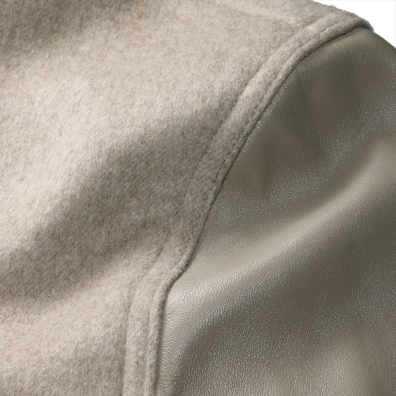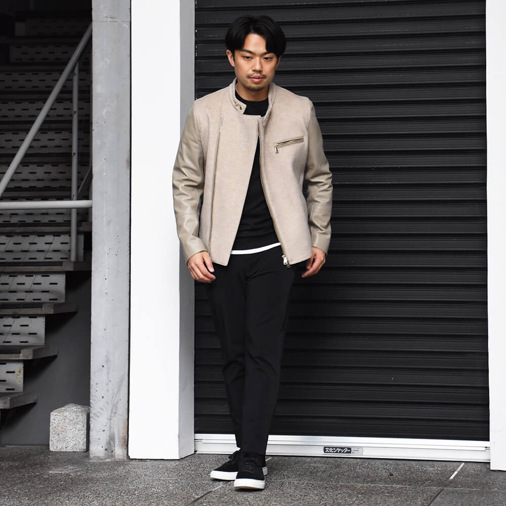 ・そもそもセミダブルはダブルライダースのハードさを抑えたデザインが特徴ですが、異素材コンビとなることで”スタジャン”的なムードも加わり、実にイマドキ顔な仕上がりとなりました。
