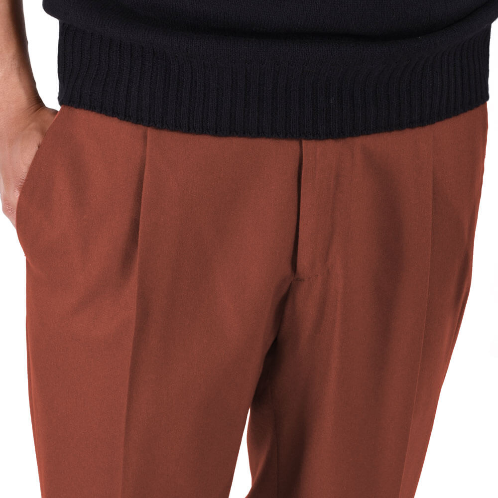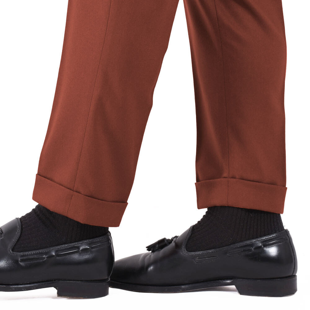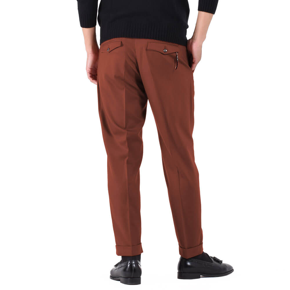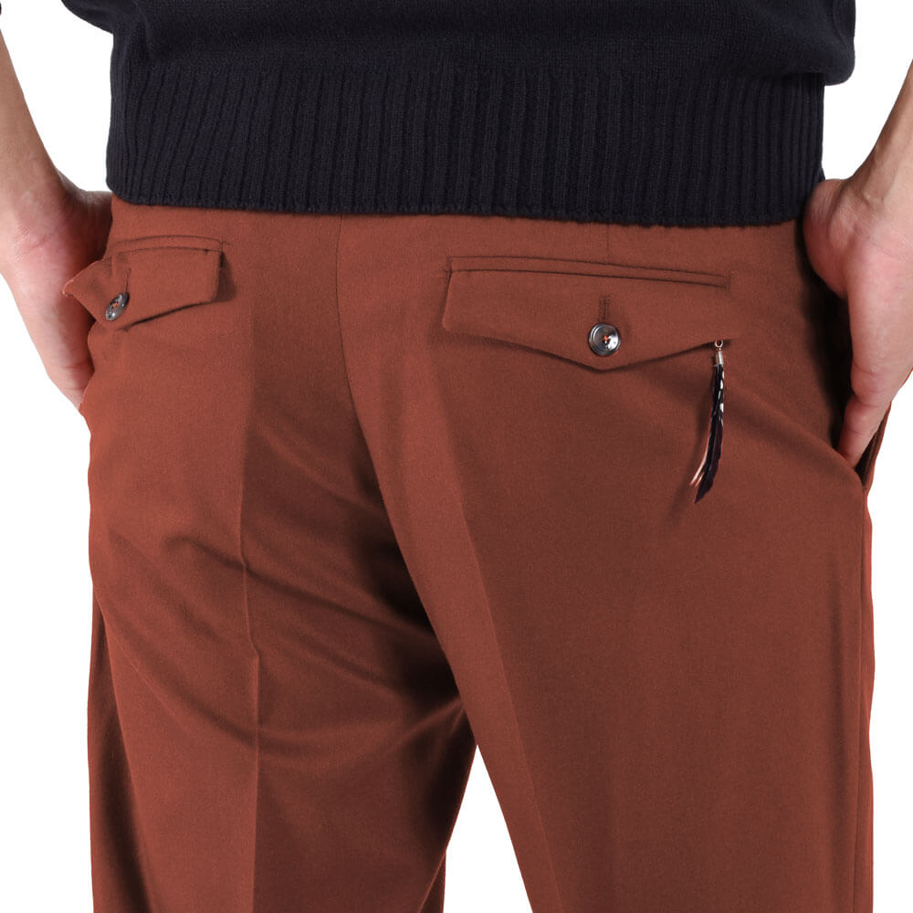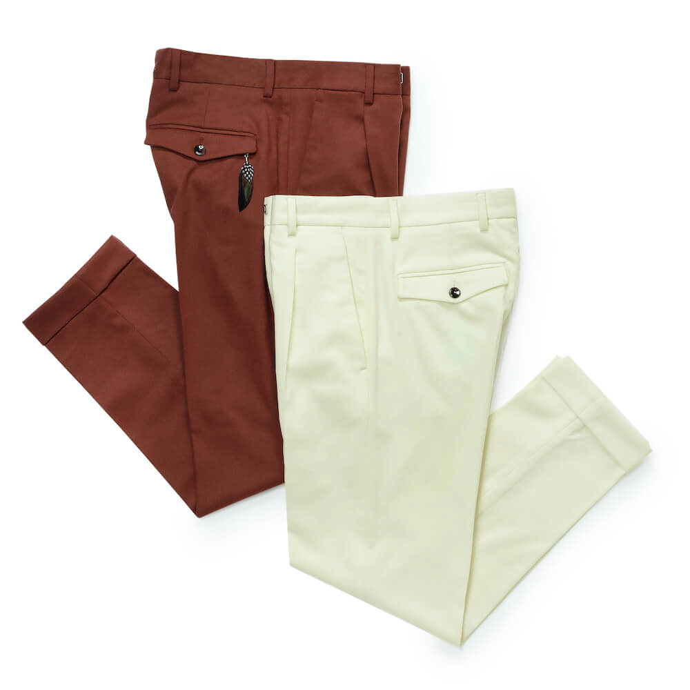 ・しっかりと確保された股上により、安心感ある腰廻りのフィッティングも特徴です。また、こちらの1プリーツモデルの裾はアンフィニッシュではなくダブルの仕上げ。(穿く方の股下寸法によっては)お直しナシで穿くことができるのも楽ですね。さらに後ろポケットにはフラップが付き、カジュアル感が加わっています。