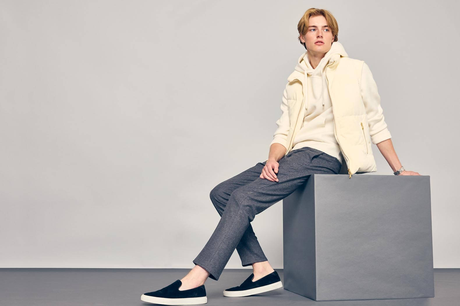 ・モデルは「giabsarchivio(ジャブスアルキヴィオ)」ならではの工夫が施されたリラックスパンツの"MASACCIO/M1(マサッチョ)"。シャープで美しいシルエットを実現している理由はフロントにクリースをおさえるステッチが入っているから。縦のラインが強調され、視覚的な脚長効果は抜群です。