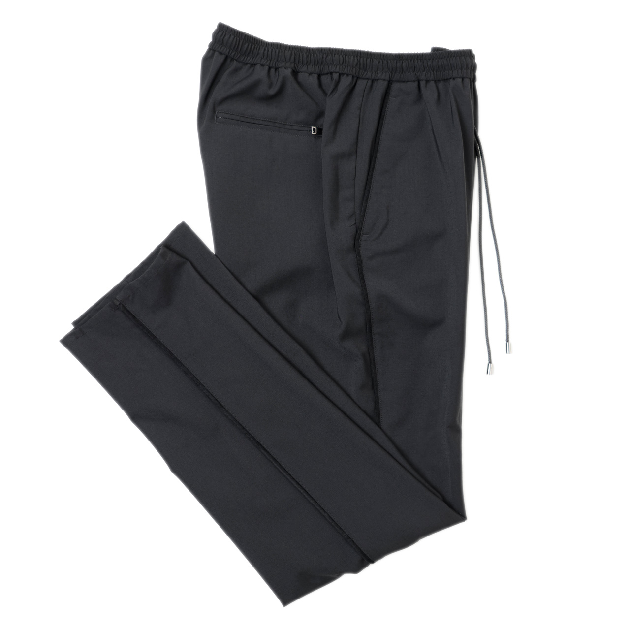 • フロントジップ、裾口タタキ仕上げ(幅1cm)、永久クリース、ノープリーツ、ウエストサイド部分シャーリングゴム&ドローコード付き