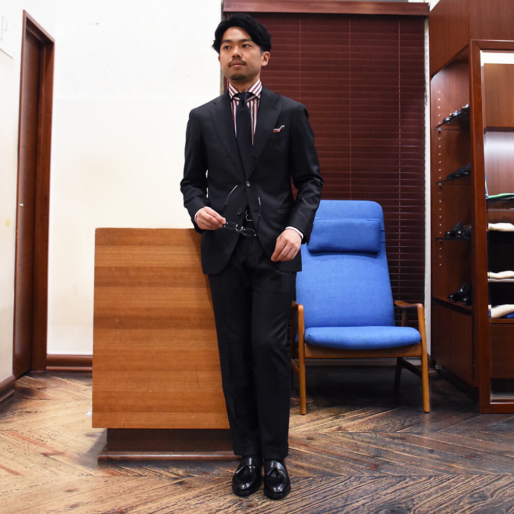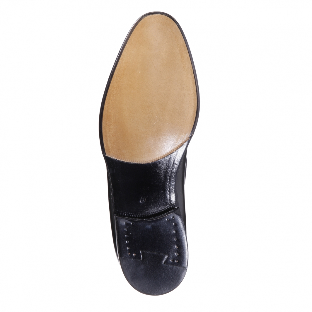 アッパーは、最高級カーフレザーで名を馳せるフランスはデュプイ社のANILOU(艶つけされた靴用アニリンカーフ)を使用。きめ細やかで艶やかな表情は、本物のカーフレザーの良さを雄弁に物語ります。質の良いレザーは手入れする楽しみが増すというもの。そして、底付けはHand sewn goodyear welted。ソールの厚み、コバの張り出しが程よく、全体のバランスとマッチ。返りが良いので履きやすく、履き込むほどに足に馴染んでいくプロセスをお楽しみ頂けます。カラーはベーシックなブラックにてご用意しました。