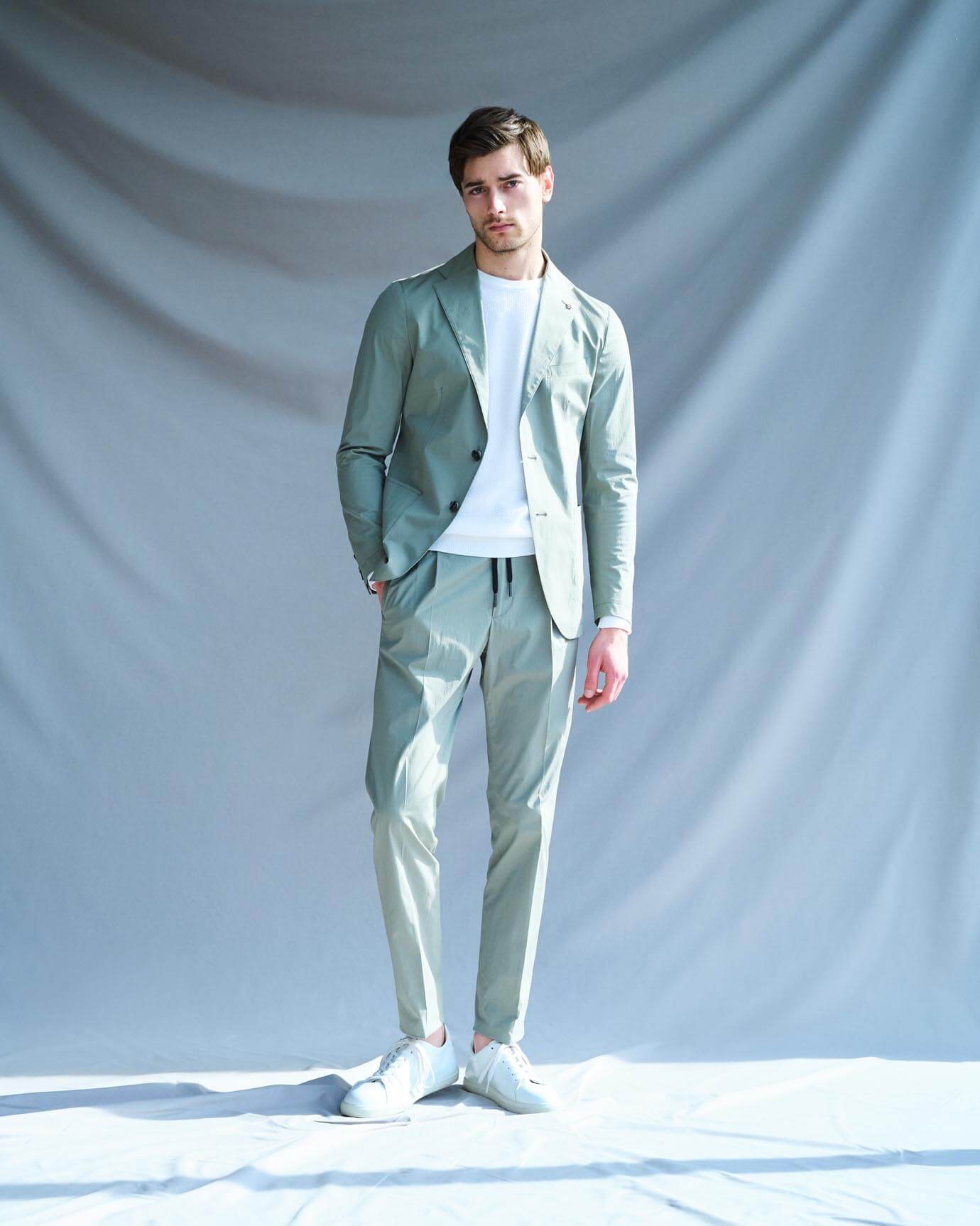 ・もはや定番となったスポーティなウエストシャーリングパンツと組み合わせられるセットアップスーツ。軽快なルックスで春夏らしさ満載なコットン生地でもラインナップしました。