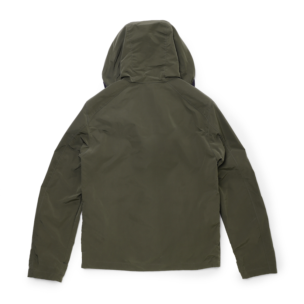 ・こちらは130度という高温で圧縮することで高密度に仕上げたポリエステル&ナイロン素材を使用したパーカー。しっかりと目が詰まっているため、肌触りが良く、素肌に触れても心地良いのです。また、軽量でコンパクトになり、風雨に強く、そして快適な柔らかさが得られるという、機能性と着心地の良さを両立した仕上がりです。