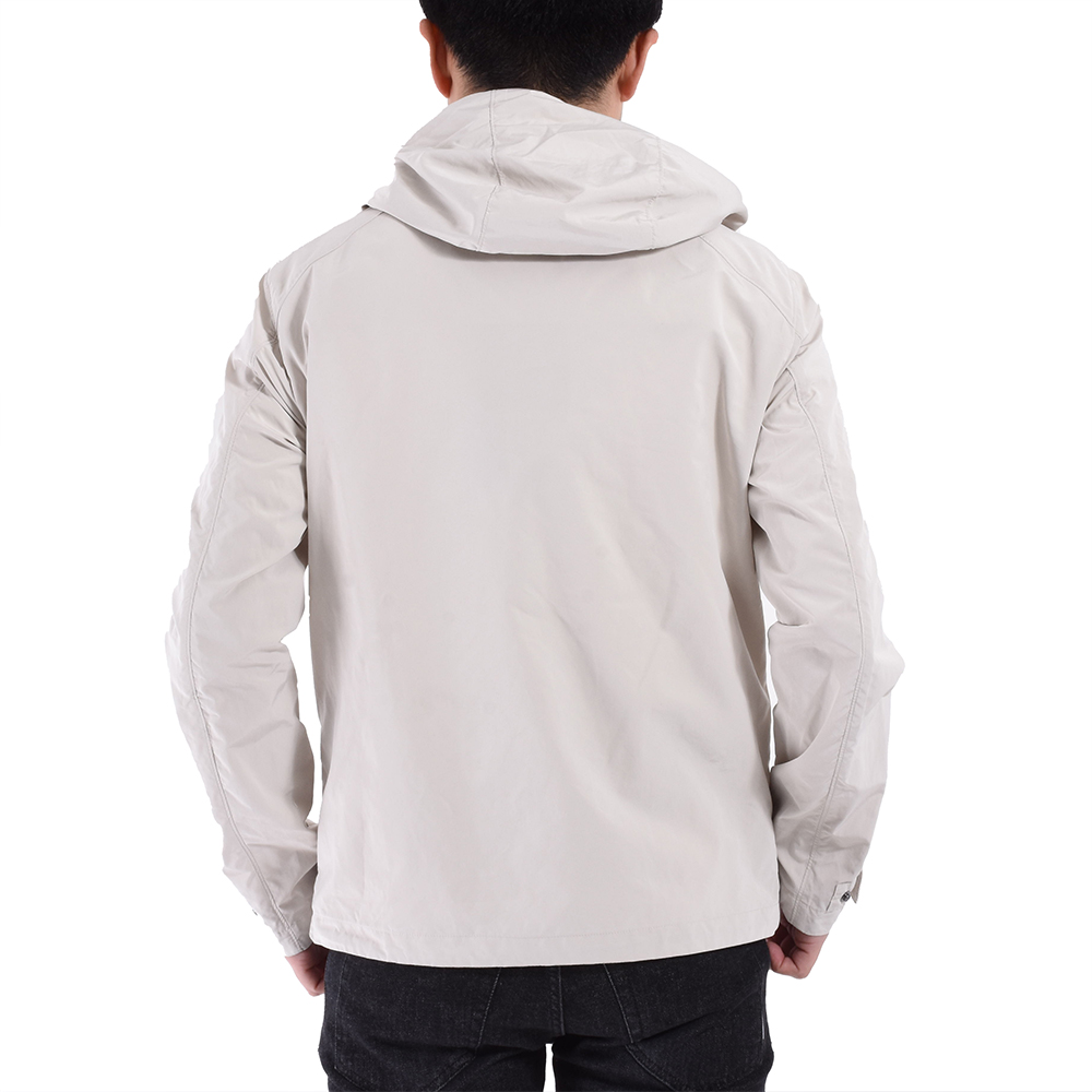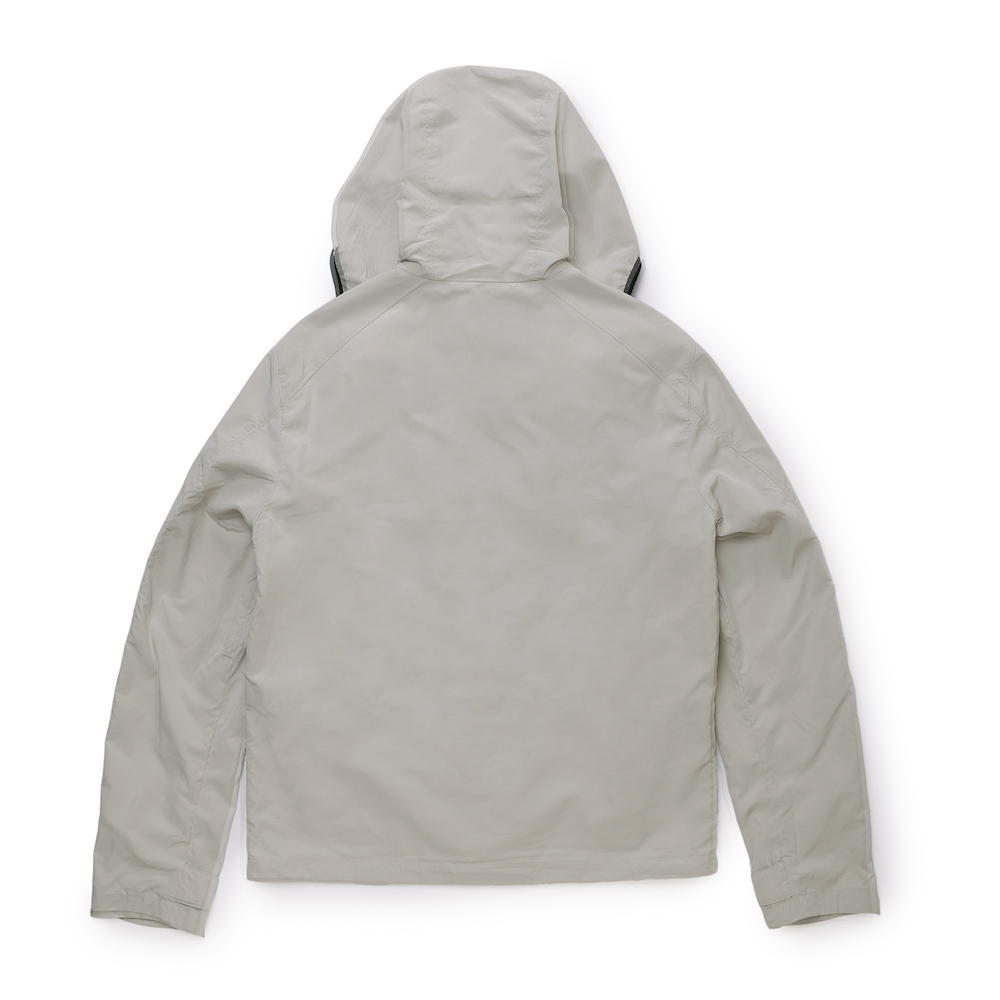 ・こちらは130度という高温で圧縮することで高密度に仕上げたポリエステル&ナイロン素材を使用したパーカー。しっかりと目が詰まっているため、肌触りが良く、素肌に触れても心地良いのです。また、軽量でコンパクトになり、風雨に強く、そして快適な柔らかさが得られるという、機能性と着心地の良さを両立した仕上がりです。